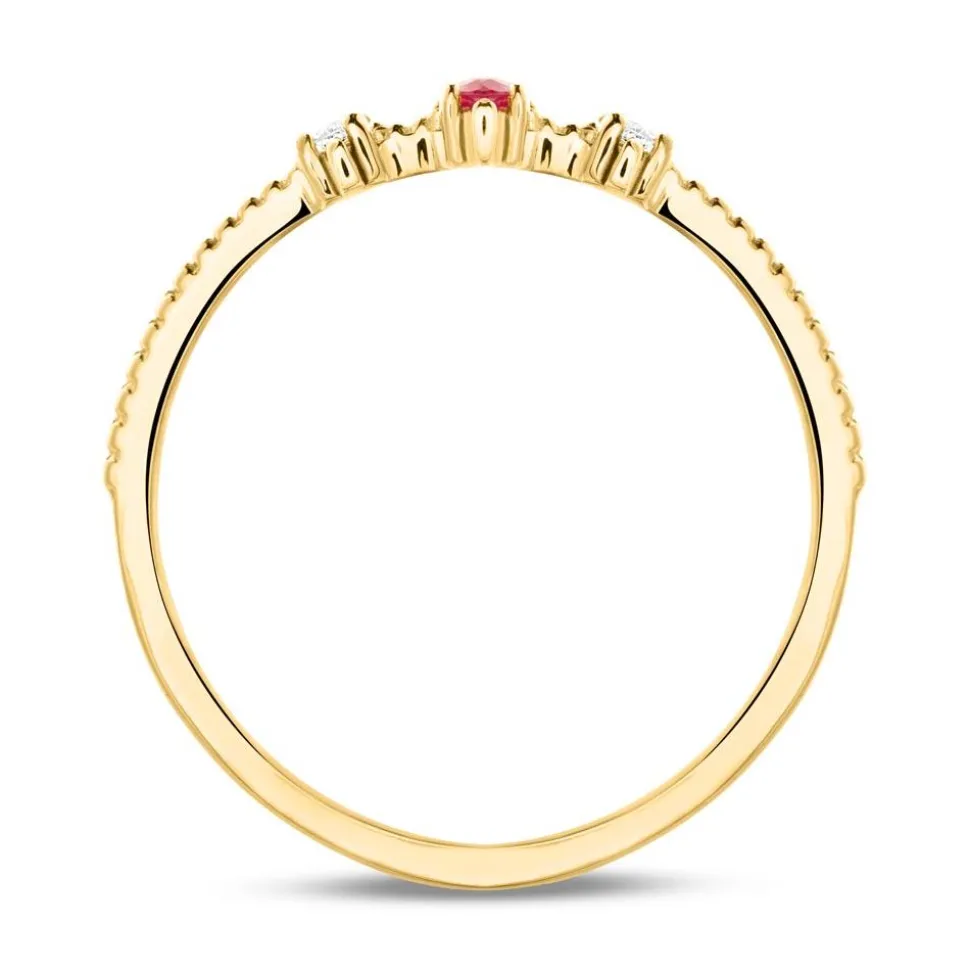 Traumhaft feminin – Das ist dieser Damenring aus 585er Gold mit 1 Rubin (ca. 0,04 ct.) und 2 Diamanten (ca. 0,02 ct.). Die Farbe der Steine ist klassifiziert als Feines Weiß (Top Wesselton) und die Reinheit fällt in die Kategorie SI (small inclusions). Wir legen bei unserem Diamantschmuck nicht nur Wert auf eine exzellente Qualität, sondern auch auf ethische Aspekte. Deshalb stammen unsere Diamanten ausschließlich aus konfliktfreien Quellen