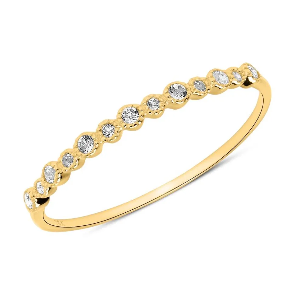 Dieser Ring besticht durch seine stilvolle Eleganz! Er besteht aus rhodiniertem 585er Gold und die filigrane Ringschiene wird bis zur Hälfte von 13 Weißtopasen (gesamt ca. 0,12 ct.) geziert, die in unterschiedlich großen Milgrain-verzierten Fassungen sitzen.