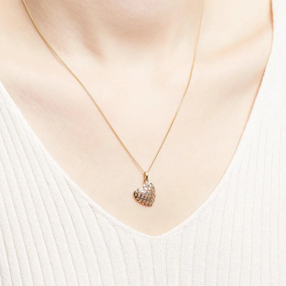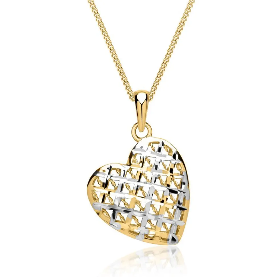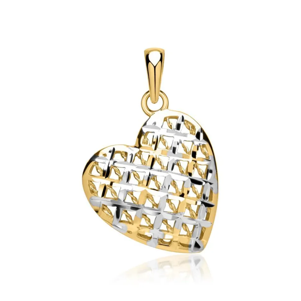 Filigraner Herzanhänger aus Gelbgold sowie Weißgold in einer 333er Legierung. Trotz fehlendem Steinbesatz funkelt der Anhänger aufgrund seiner raffinierten Form unablässig.