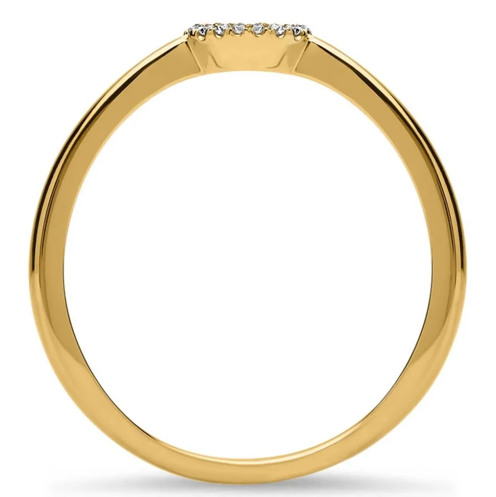 Geometrische Formen bestimmen das Design dieses Rings aus 750er Gelbgold. Die Ringform des Schmuckstücks wiederholt sich noch einmal in dem kreisrunden Element, das die Ringschiene krönt. Eigentliches Highlight sind die weißen Diamanten mit 0,05 ct (gesamt). Die 19 Edelsteine sorgen für enormes Funkeln. Eine Lasergravur ist möglich: Die Steine sind in einer Pavé-Fassung gefasst. Von einer Pavé-Fassung spricht man, wenn Steine dicht nebeneinander angeordnet sind und wie gepflastert wirken, denn so lautet die Übersetzung des französischen Begriffs. Der Diamantring kann auf Wunsch mit einer persönlichen Lasergravur versehen werden.