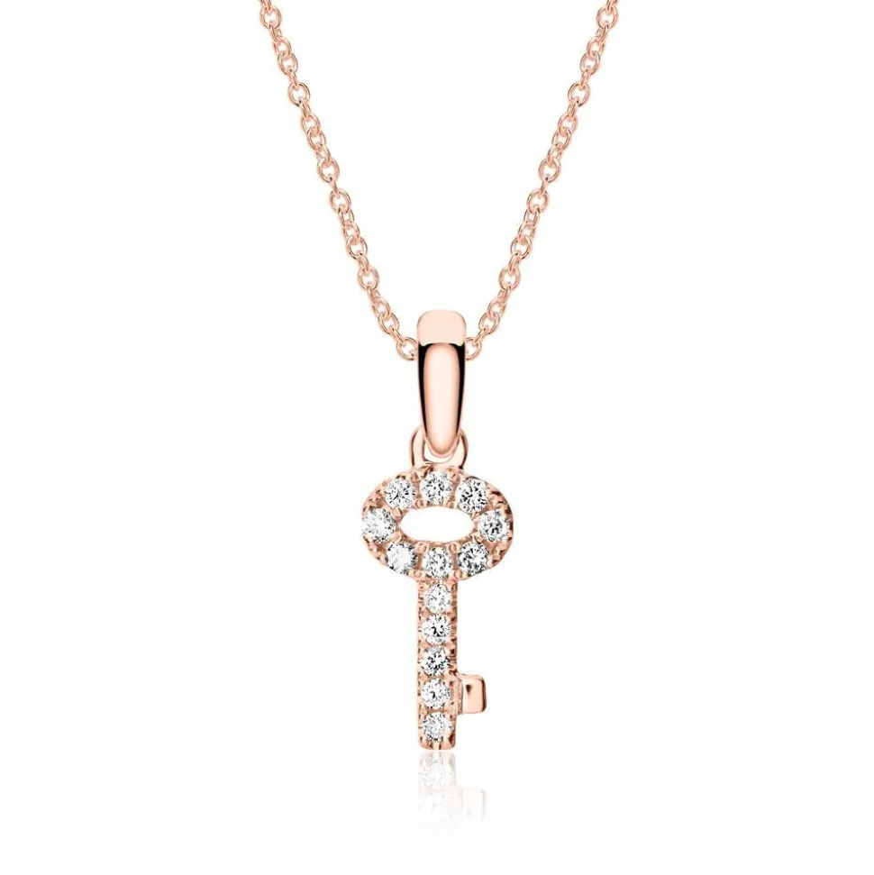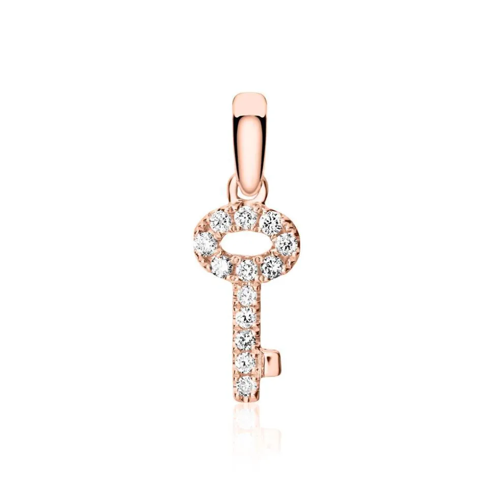 Stylish und exklusiv – das ist dieser Anhänger in Form eines Schlüssels. Er ist aus 18-karätigem Roségold gefertigt und wird auf der gesamten Vorderseite von 13 Diamanten (ca. 0,06 ct.) im Brillantschliff geziert. Die Farbe der verarbeiteten Diamanten ist klassifiziert als Feines Weiß (Top Wesselton) und die Reinheit der Steine fällt in die Kategorie SI (small inclusions). Wir legen bei unserem Diamantschmuck nicht nur Wert auf eine exzellente Qualität, sondern auch auf ethische Aspekte. Deshalb stammen unsere Diamanten ausschließlich aus konfliktfreien Quellen.