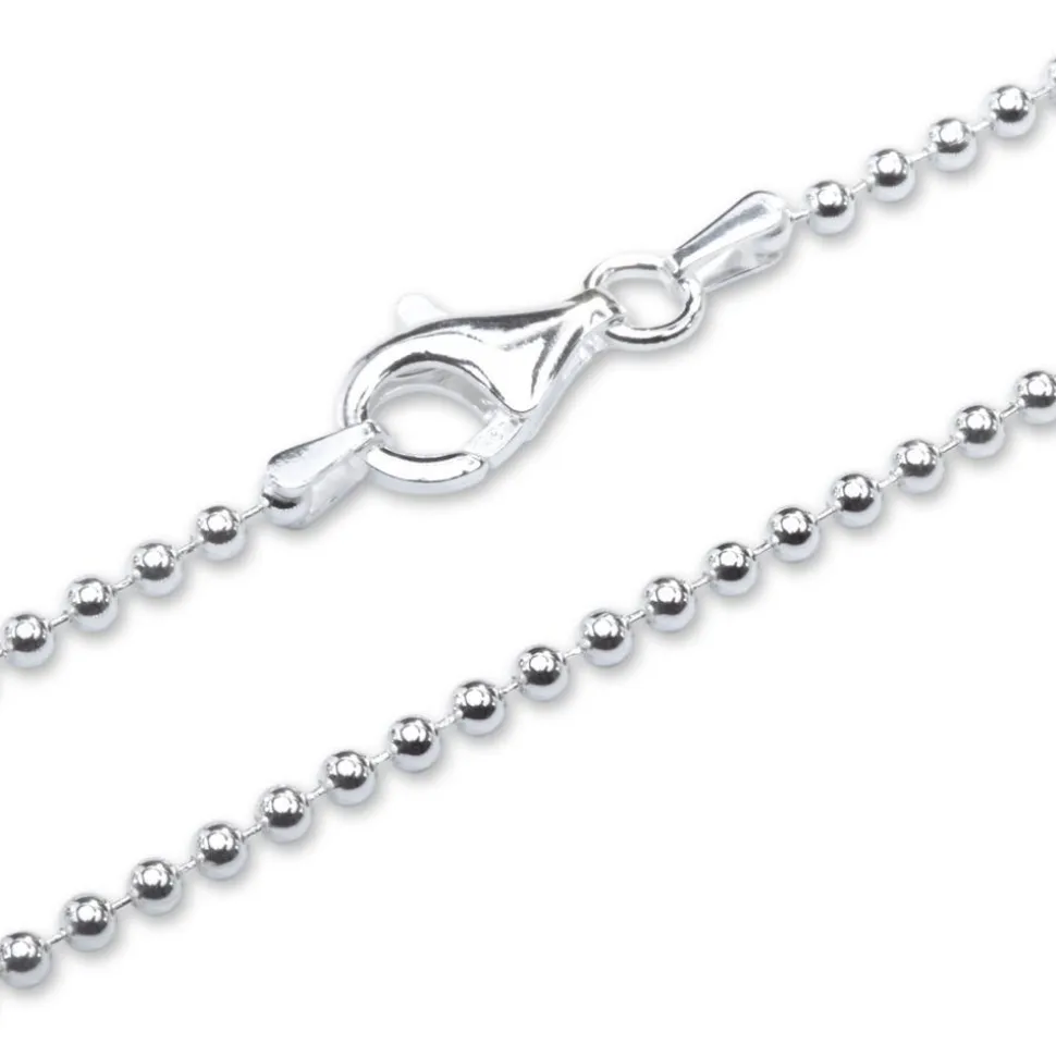 Hochwertige Kugelkette in 2,2mm Breite. Die Kugelkette ist aus echtem 925 Sterling Silber und entsprechend gestempelt. Die Kette fügt über einen praktischen Karabinerverschluss sowie hochwertige Endeinfassungen. Die Oberfläche der Kugelkette ist hochglanzpoliert. Kugelketten eignen sich hervorragend zum Tragen von Anhängern.