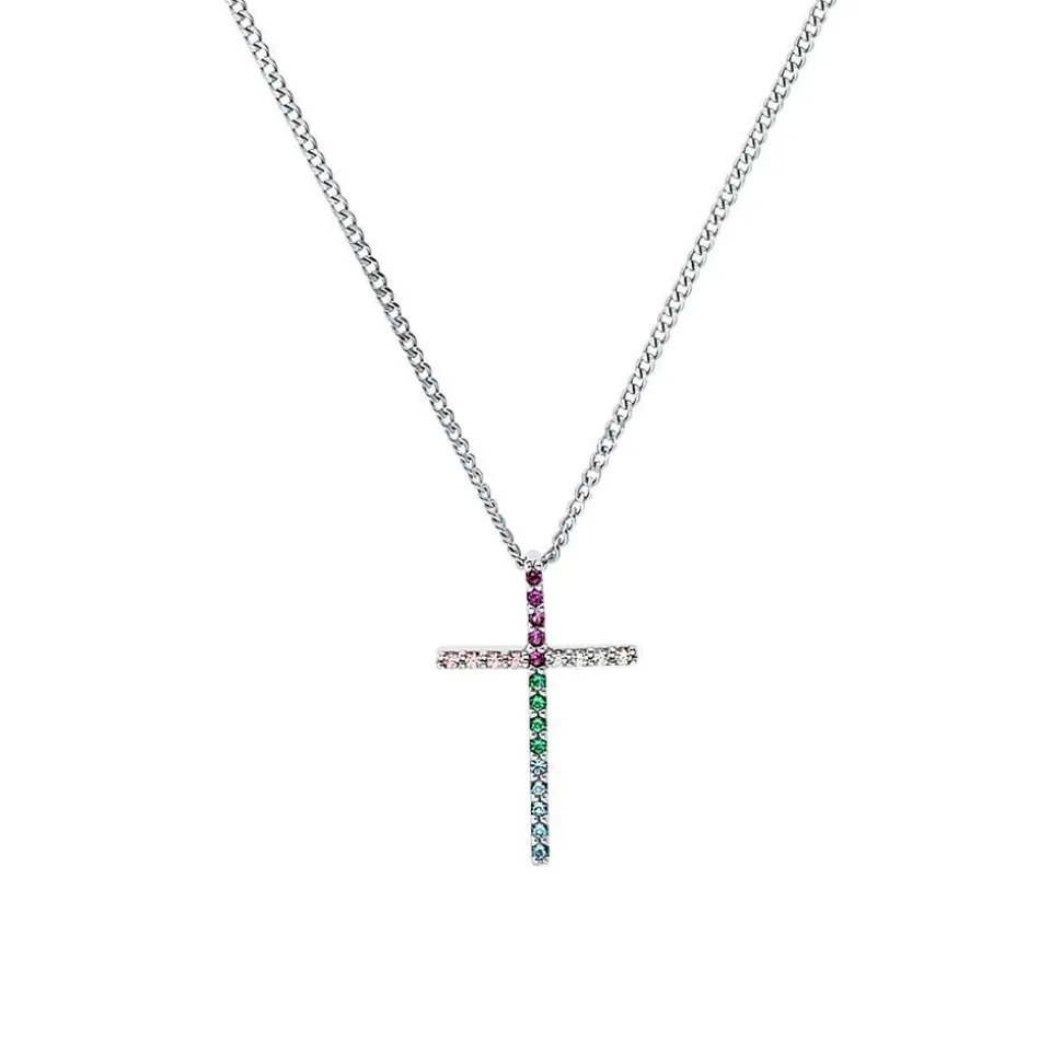Symbolstark – das ist diese Halskette für Mädchen. Sie besteht aus rhodiniertem Sterlingsilber und besitzt als Anhänger ein Kreuz. Dieses ist mit Zirkonia in Fuchsia, Hellrosa, Grün und Hellblau besetzt. Geschlossen wird die längenverstellbare Kette mit einem klassischen Karabiner.
