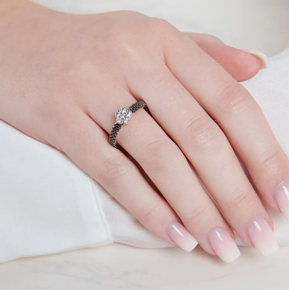 Moderner Ring aus anlaufgeschütztem Sterlingsilber. Der Ring ist zudem mit mehreren Zirkonia besetzt.