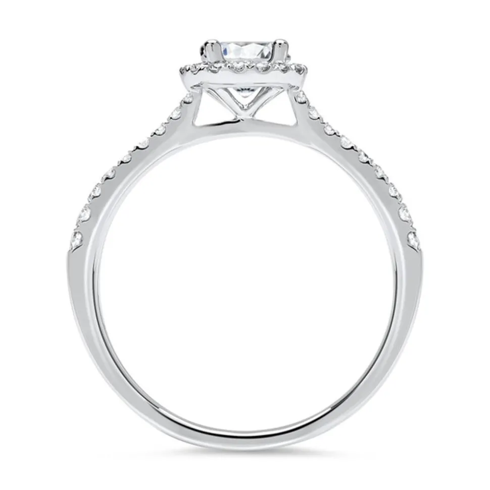 Halo-Ringe sind durch ihr klassisches und zeitloses Design äußerst beliebt als Verlobungsringe. Die Hälfte der Ringschiene und der Ringkopf werden von insgesamt 34 brillantgeschliffenen Diamanten (ca. 0,25 ct.; Farbe: Top Wesselton, Reinheit: small inclusions) geziert, die den Brillanten (ca. 0,50 ct.), den Sie von uns in die Krappen fassen lassen können, besonders hervorheben. Der edle Glanz des 950er Platins bildet einen ansprechenden Kontrast zum Funkeln der Diamanten. Zudem ist der Ring rhodiniert und somit vor dem Anlaufen geschützt. Unser Gravurservice ermöglicht es Ihnen den Ring mit einem persönlichen Statement zu versehen. Bei uns wird Qualität groß geschrieben. Daher prüfen wir jeden einzelnen Ring, bevor er unser Haus verlässt. Da uns auch ethische Aspekte am Herzen liegen, verarbeiten wir ausschließlich Diamanten aus konfliktfreien Quellen. Der Hauptdiamant ist von dem renommierten Gemological Institute of America (GIA) zertifiziert. Dieses Zertifikat gibt Auskunft über die Herkunft, Echtheit und alle weiteren wertbestimmenden Merkmale.