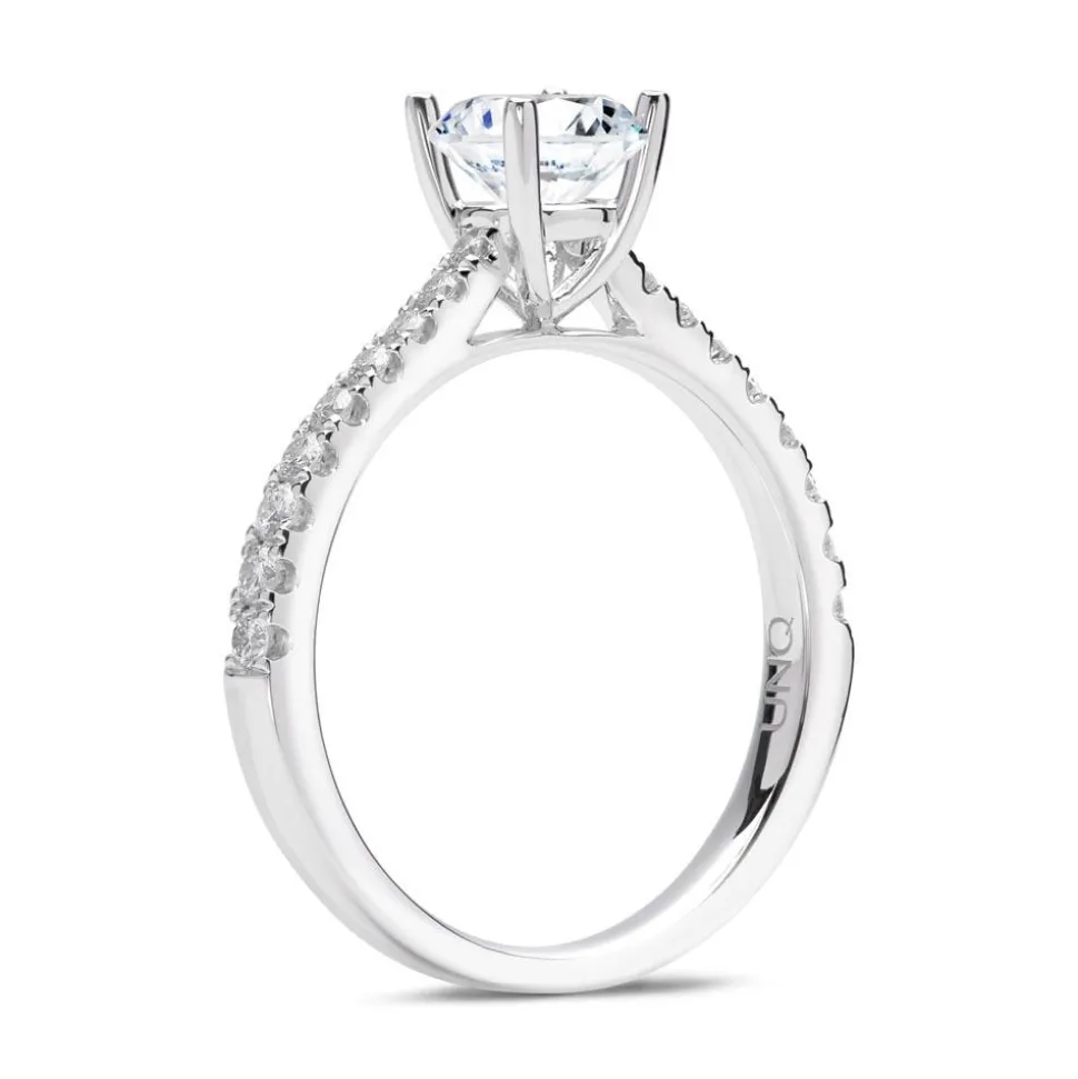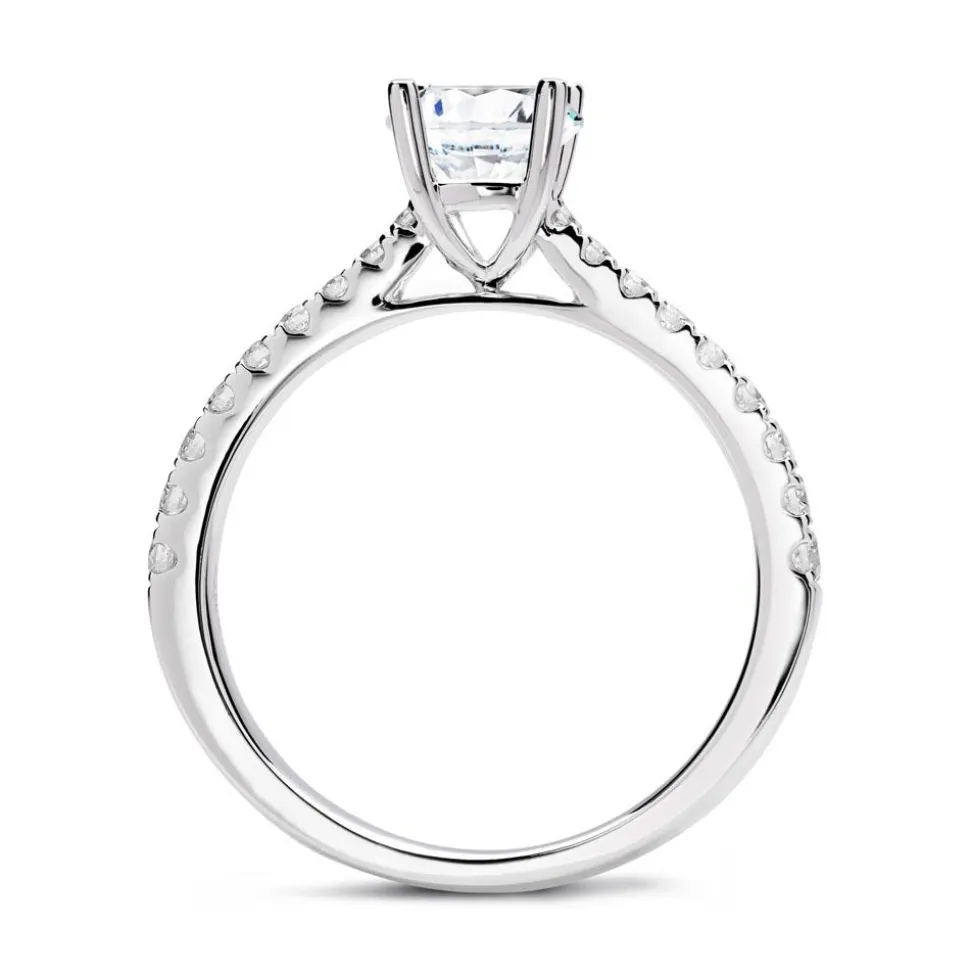 Der Ring aus 950er Platin besticht durch sein klassisches Design und wird in Rekordzeit zum neuen Star in Ihrer Schmucksammlung werden. Die Ringschiene ist bis zur Hälfte mit 18 brillantgeschliffenen Diamanten (ca. 0,24 ct.; Farbe: Top Wesselton, Reinheit: small inclusions) in Pavéfassung besetzt. Es besteht die Möglichkeit in die Krappen einen Brillanten (ca. 0,50 ct.) fassen und die Innenseite des Ringes mit Ihrer Wunschgravur versehen zu lassen. Das Funkeln der Diamanten und der edle Glanz des Weißgoldes vereinen sich bei diesem Ring zu einem optisch abwechslungsreichen Schmuckstück. Für uns ist es selbstverständlich, dass unsere Diamanten ausschließlich aus konfliktfreien Quellen stammen. Der Hauptdiamant ist von dem renommierten Gemological Institute of America (GIA) zertifiziert. Dieses Zertifikat gibt Auskunft über die Herkunft, Echtheit und alle weiteren wertbestimmenden Merkmale.