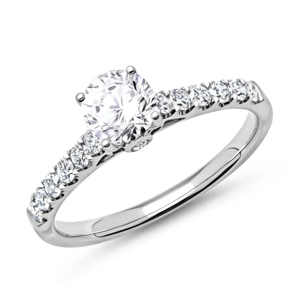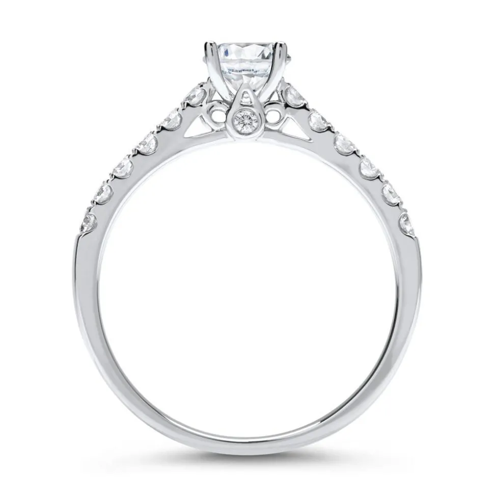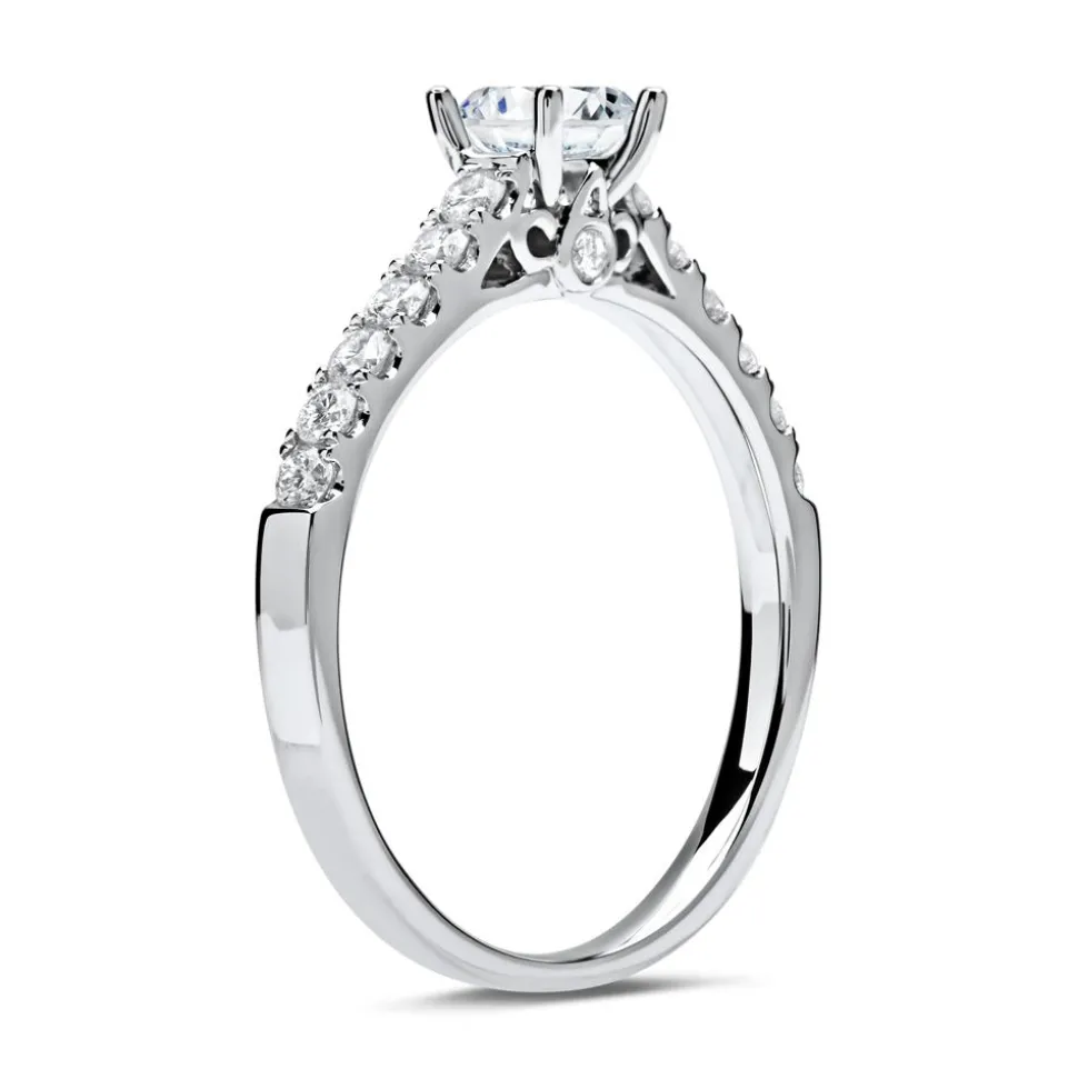 Bei diesem Ring erwartet Sie feinste Juwelierskunst. Daher und durch sein klassisches Design eignet er sich perfekt als Verlobungsring. Die 14 Brillanten (ca. 0,34 ct.; Farbe: Top Wesselton, Reinheit: small inclusions) in Pavéfassung zieren sowohl einen Teil der filigranen Ringschiene als auch das Profil des Ringkopfes und werden den Hauptdiamanten (ca. 0,50 ct.) im Brillantschliff, den Sie von uns fassen lassen können, perfekt in Szene setzen. Der edle Glanz des 950er Platins bildet einen ansprechenden Kontrast zum Funkeln der Diamanten. Wir legen bei unserem Diamantschmuck nicht nur Wert auf eine exzellente Qualität, sondern auch auf ethische Aspekte. Deshalb stammen unsere Diamanten ausschließlich aus konfliktfreien Quellen. Der Hauptdiamant ist von dem renommierten Gemological Institute of America (GIA) zertifiziert. Dieses Zertifikat gibt Auskunft über die Herkunft, Echtheit und alle weiteren wertbestimmenden Merkmale. Außerdem können Sie die Innenseite des Ringes mit Ihrer Wunschgravur versehen lassen und durch die hochwertige Rhodinierung ist der Ring anlaufgeschützt.