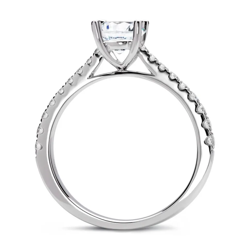 Durch das zeitlose Design des Ringes aus 950er Platin und den funkelnden Steinbesatz eignet er sich perfekt als Verlobungsring. Die 18 Brillanten (ca. 0,26 ct.; Farbe: Top Wesselton, Reinheit: small inclusions) in Pavéfassung zieren die Hälfte der filigranen Ringschiene, wodurch der Hauptstein (ca. 0,70 ct.) noch besser zur Geltung kommt. Zudem kann die Innenseite des Ringes mit einem Wunschtext versehen werden. Der Hauptdiamant ist von dem renommierten Gemological Institute of America (GIA) zertifiziert. Dieses Zertifikat gibt Auskunft über die Herkunft, Echtheit und alle weiteren wertbestimmenden Merkmale. Neben höchsten Qualitätsstandards, die wir bei jedem einzelnen Schmuckstück von Hand prüfen, achten wir auch auf ethische Aspekte. Deshalb stammen unsere Diamanten ausschließlich aus konfliktfreien Quellen.