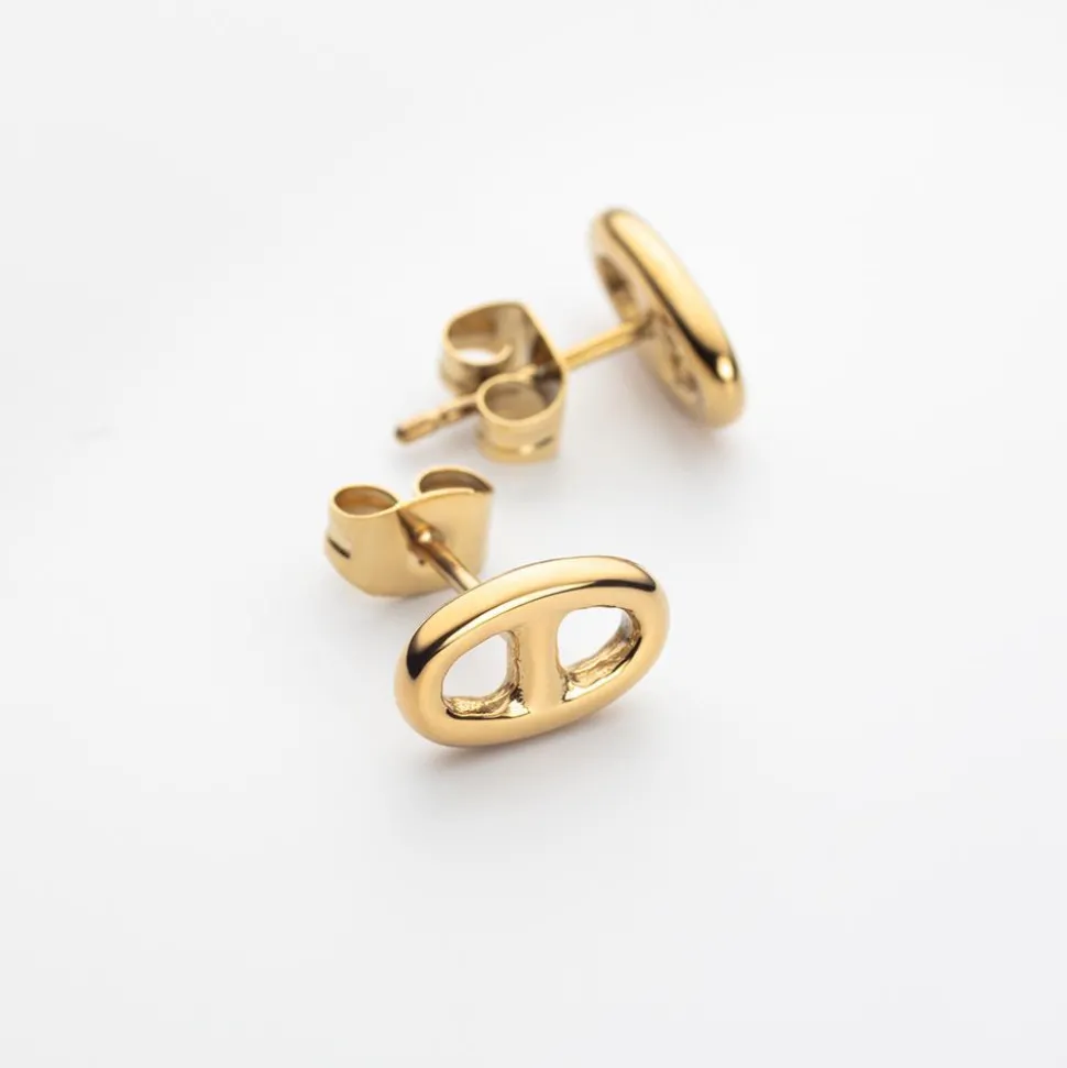 Traumhaft lässig – das sind diese Ohrstecker für Damen, jeweils in Form eines Ankerkettenelements. Sie sind aus Edelstahl gefertigt, welcher mit 14 Karat Gold beschichtet ist.