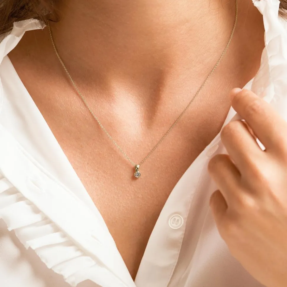 Zauberhaft elegant – das ist dieser 14-karätige Goldanhänger für Damen. Highlight ist der zargengefasste Diamant (ca. 0,10 ct., Farbe: TW, Reinheit: SI). Neben höchsten Qualitätsstandards, achten wir auch auf ethische Aspekte. Daher stammen unsere Diamanten ausschließlich aus konfliktfreien Quellen.