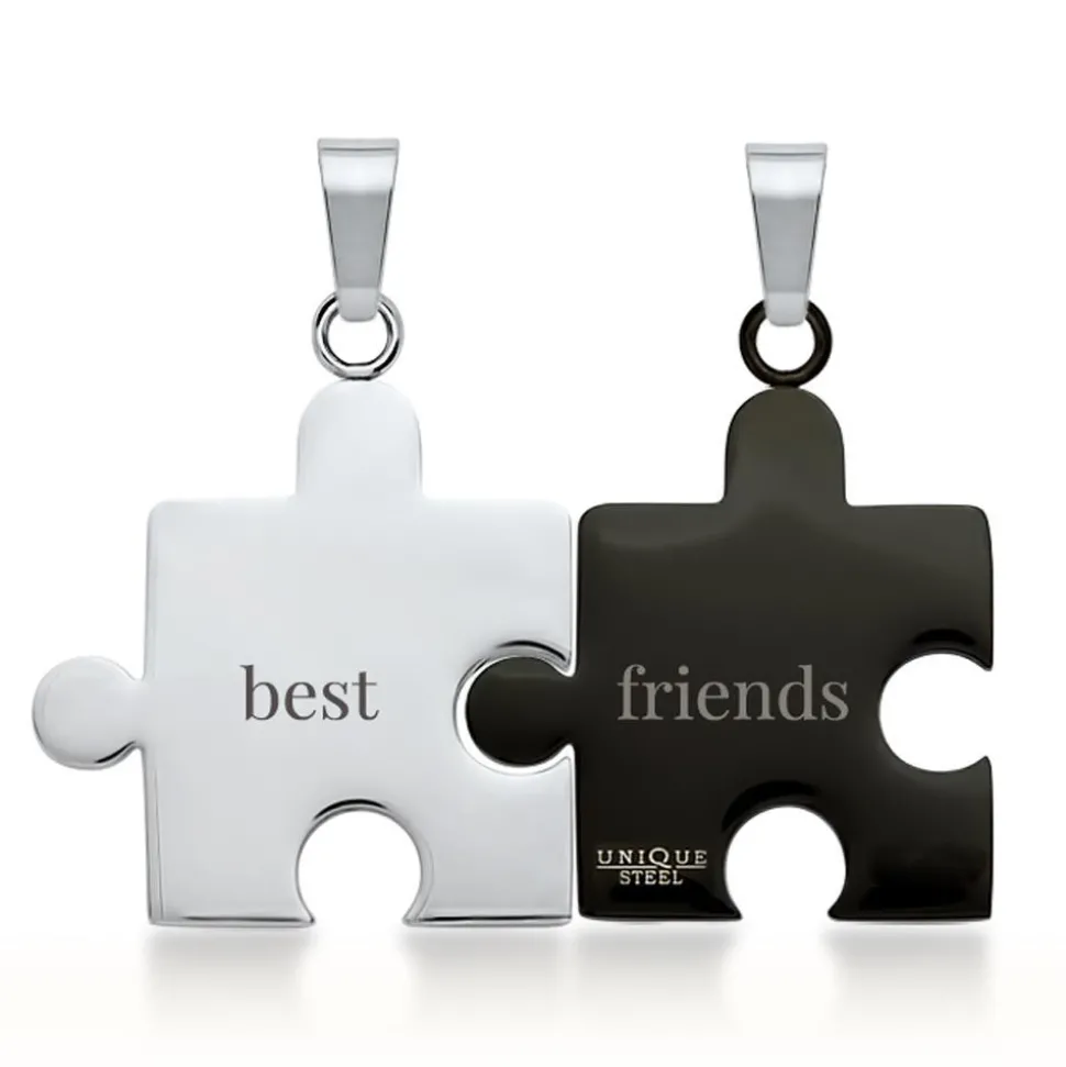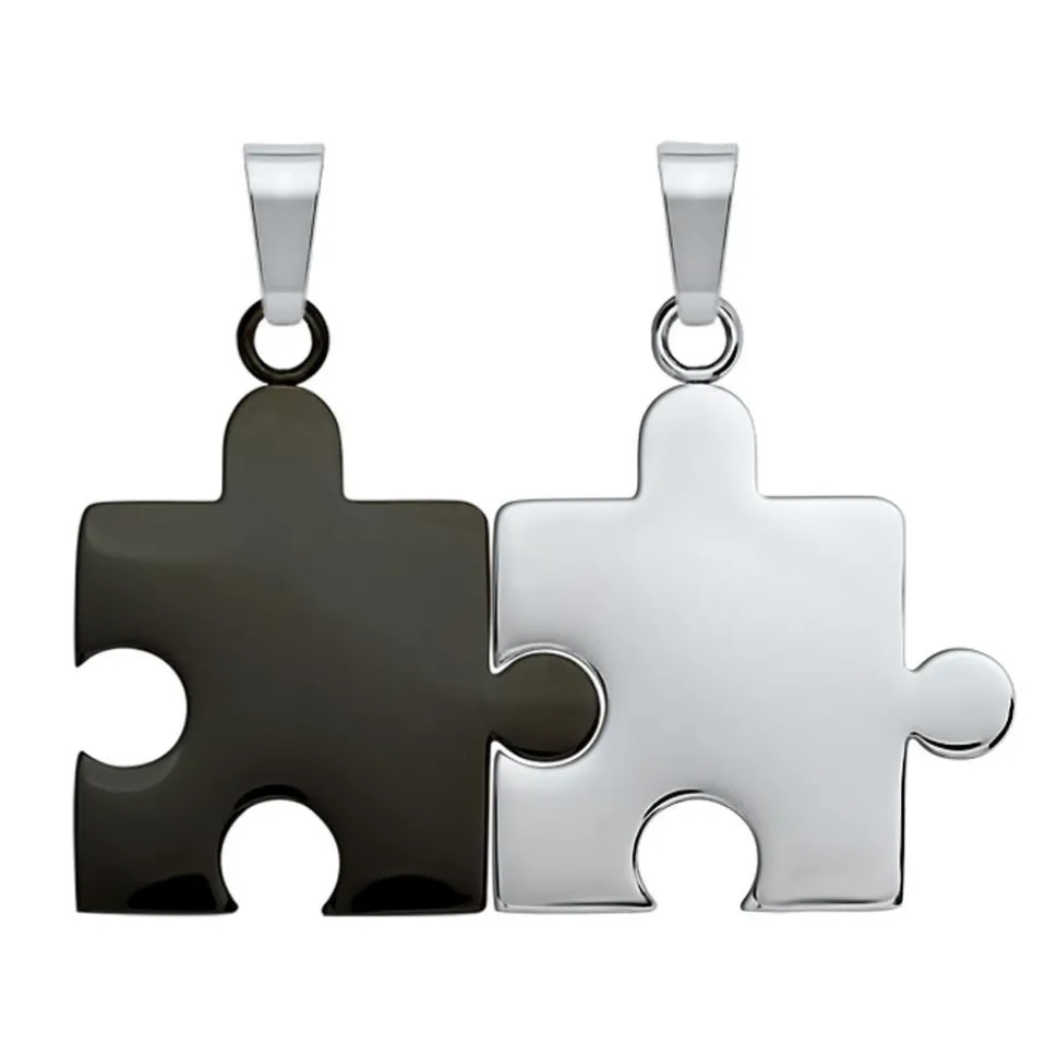 Modisches Anhängerpaar in Form zweier Puzzleteile aus Edelstahl. Die Puzzleteile sind in den Farben Silber und Schwarz gehalten und können mit einer Gravur versehen werden. Sie besitzen zusammengenommen eine Breite von ca 50mm. Bitte beachten Sie zwecks Gravur: Anhänger 1 ist der in der Frontalansicht abgebildete linke Anhänger, Anhänger 2 ist der in der Frontalansicht abgebildete rechte Anhänger