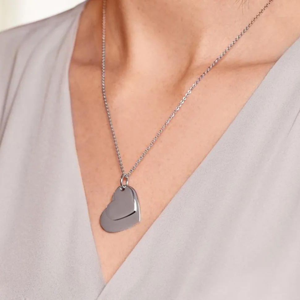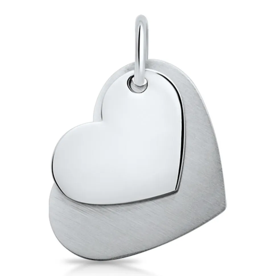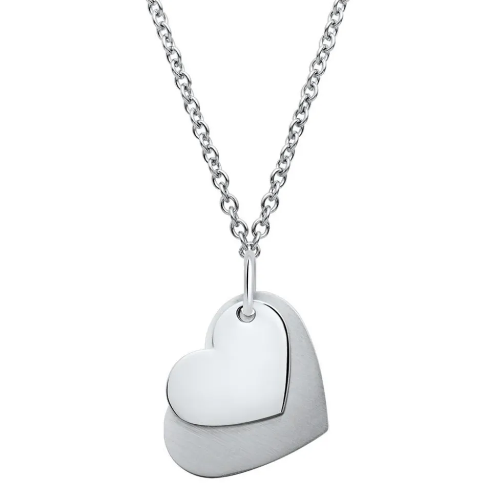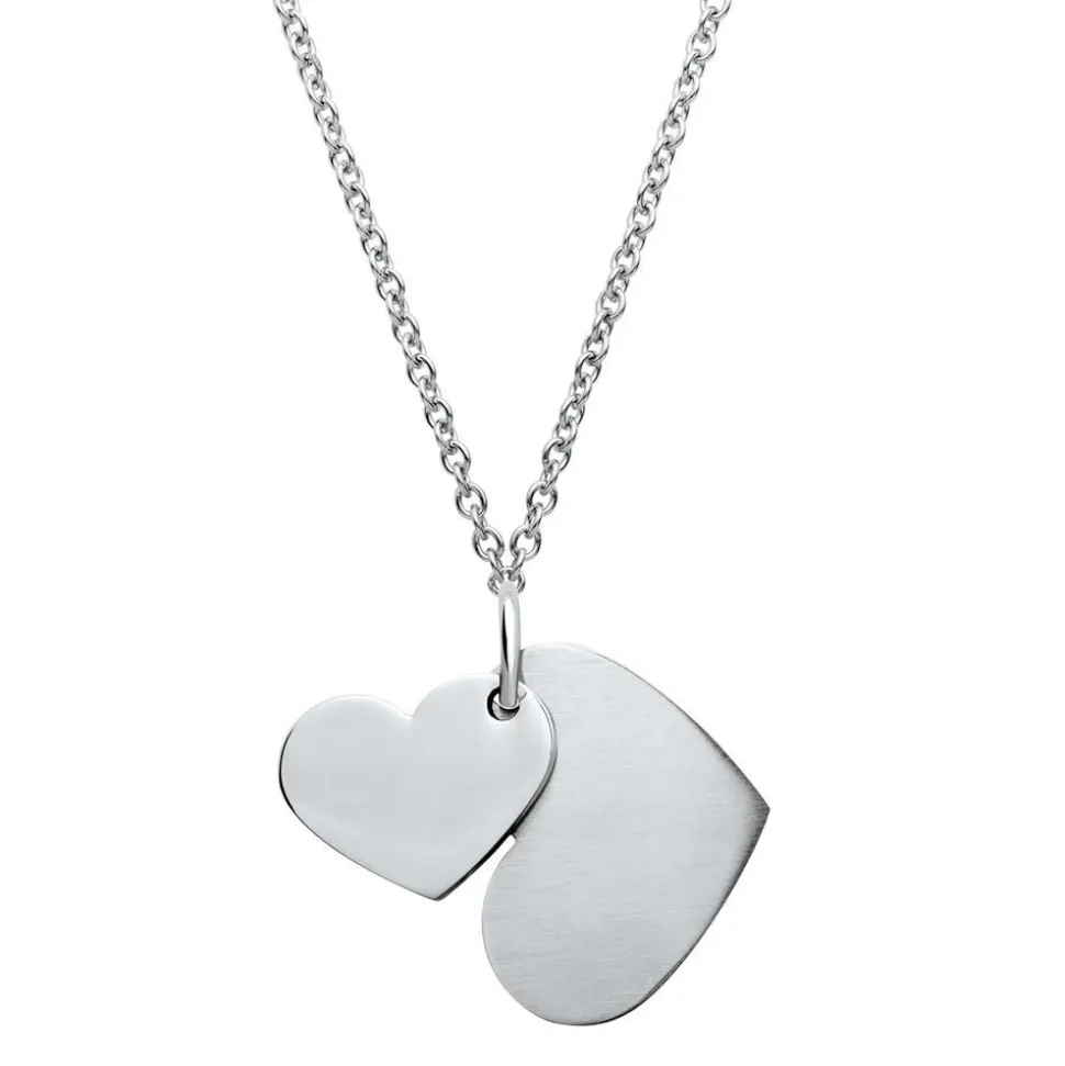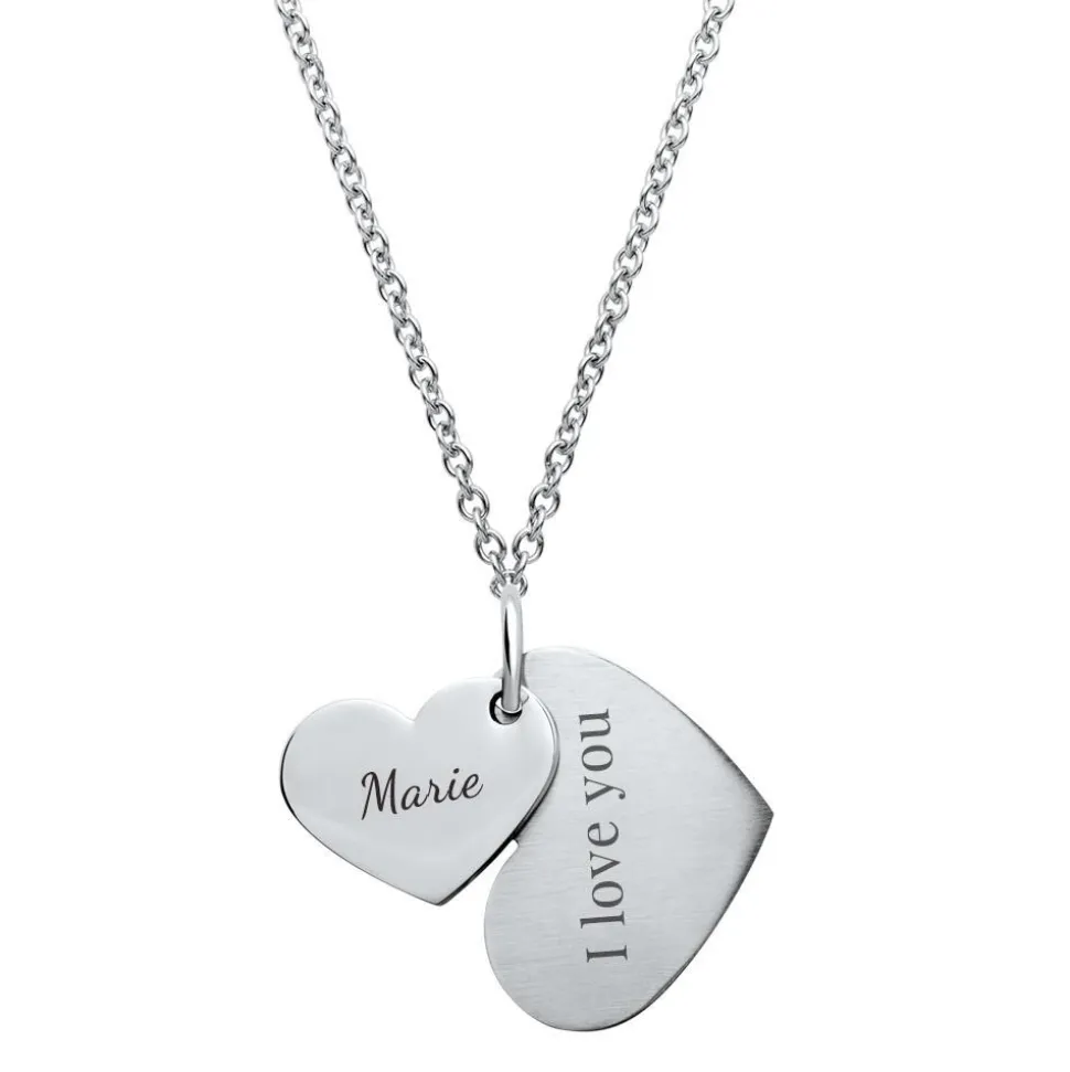 Hochwertiger Anhänger aus Edelstahl. Der Anhänger besteht aus zwei Herzen, die graviert werden können. Das vordere kleine Herz ist glänzend, das hintere große Herz auf der Vorderseite matt und der Rückseite hochglanzpoliert, dadurch entsteht ein schöner Kontrast. Gegen einen Aufpreis können Sie zudem die abgebildete Kette erwerben. Bitte beachten Sie zwecks Gravur: „Anhänger 1“ bezieht sich auf den größeren, im Hintergrund befindlichen Anhänger, während „Anhänger 2“ sich auf den vorderen, kleineren Anhänger bezieht.