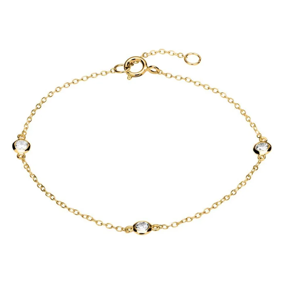 Dieses Armband für Damen ist durch das zeitlose Design ein absolutes Kombinationstalent! Es besteht aus 925er Silber, welches mit einer hochwertigen Vergoldung beschichtet wurde. Zwischen die filigranen Ankerkettenglieder sind drei Zirkoniasteine eingearbeitet, die mit ihrem reinweißen Funkeln einen ansprechenden Kontrast zu dem edlen Goldglanz bilden.Das Armband besitzt einen Federringverschluss. Dank der integrierten Zwischenöse kann es um ca. 2-3 cm in der Länge verkürzt werden. Zudem ist die Armkette rhodiniert und somit vor dem Anlaufen geschützt.