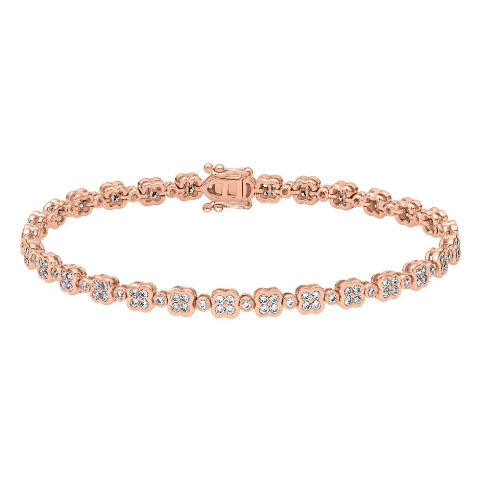 Dieses Armband für Damen begeistert mit seinem kunstvollen Design. Da es in zwei verschiedenen Legierungen erhältlich ist – 585er oder 750er Roségold – kann die gewünschte Legierung über das Drop-down-Feld ausgewählt werden. Das Armband besteht aus aneinandergereihten Schmuckelementen, deren Design an ein Vierpass erinnert. Sie sind mit jeweils 4 lab-grown Diamanten besetzt und wechseln sich mit zargengefassten lab-grown Diamanten ab. Jeder der insgesamt 145 brillantgeschliffenen Diamanten (gesamt ca. 1,51 ct.) wurde im Labor hergestellt und weist die Reinheit „very very small inclusions“ bis „very small inclusions“ auf. Ihre Farbe fällt in die Kategorien „Hochfeines Weiß+“ bis „Top Wesselton“. Ein Brilladia-Zertifikat gibt Auskunft über alle wichtigen Qualitätsmerkmale der Steine. Durch die zwei Sicherheitsbügel an den Seiten des Steckverschlusses sitzt die Armkette fest am Handgelenk.