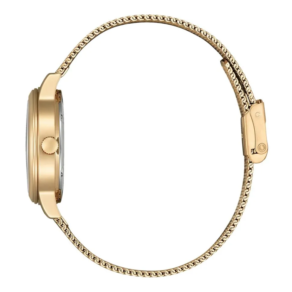 Überaus stilvoll präsentiert sich diese Quarzuhr für Damen. Sie ist aus goldfarbenem IP-beschichtetem Edelstahl gefertigt und besitzt ein modernes Milanaiseband mit Klappverschluss. Die verbaute Eco-Drive Technologie nutzt einfallendes Licht, so dass kein Batteriewechsel erforderlich ist (Gangreserve: 180 Tage). Das weiße Zifferblatt ist mit drei Zeigern, römischen Ziffern und einer Datumsanzeige versehen und wird von Kristallglas geschützt. Das Uhrengehäuse ist bis zu einem Druck von 10 bar wasserdicht.