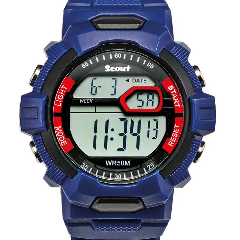 Funktional und modern – das ist diese digitale Kinderuhr. Sie besitzt ein präzises Quarzuhrwerk mit einer digitalen Zeitanzeige. Auf dem Display wird neben der Uhrzeit, auch das Datum und der Wochentag angezeigt. Außerdem besitzt die Uhr eine Alarm-, Stopp- und Beleuchtungsfunktion. Das Gehäuse und Armband der Uhr bestehen aus weichem und dennoch widerstandsfähigem Kunststoff in blauer Farbe. Der Gehäuseboden ist aus Edelstahl. Die Uhr ist bis zu einem Druck von 5 bar wasserdicht und das Armband wird mit einer Dornschließe geschlossen.
