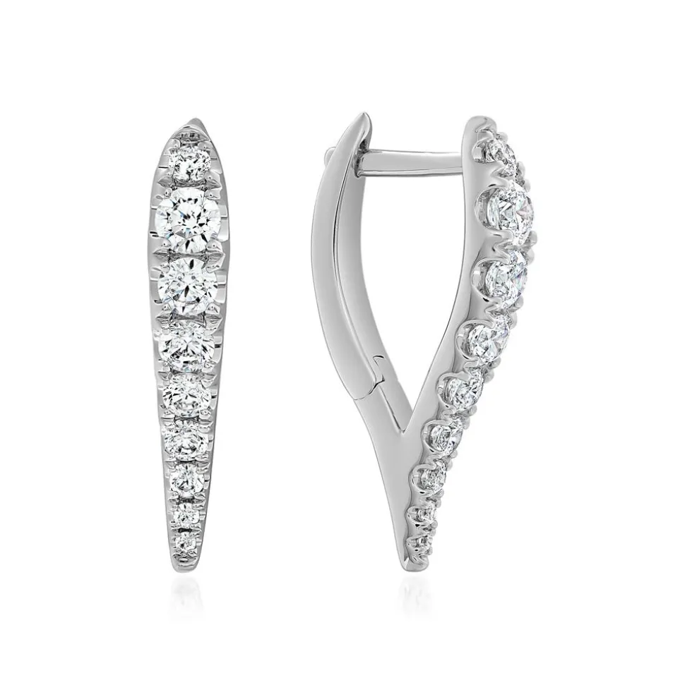 Stilvolle Eleganz – das strahlen diese Creolen für Damen aus! Es kann gewählt werden, aus welcher Legierung der Ohrschmuck bestehen soll: 585er oder 750er Weißgold oder 950er Platin. Dafür bitte das gewünschte Material im Drop-down-Feld auswählen. Sie erinnern in der Seitenansicht an ein geschwungenes „V“ und sind auf der Vorderseite mit insgesamt 18 brillantgeschliffenen Lab Grown Diamanten (ca. 0,65 ct.; DEF/VVS-VS) besetzt. Die Steine haben unterschiedliche Größen bzw. Gewichte, die im Verlauf angeordnet sind. Alle Diamanten sind durch ein modernes Herstellungsverfahren im Labor produziert worden und unterscheiden sich in den wertbestimmenden Merkmalen nicht von natürlichen Diamanten. Sie besitzen die Farbe „River“ bis „Top Wesselton“ und ihre Reinheit fällt in die Kategorie „very, very small inclusions“ bis „very small inclusions“. Der Ohrschmuck verfügt über ein Brilladia-Zertifikat.