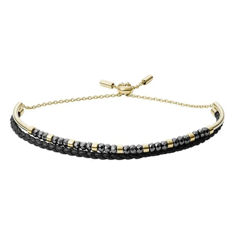 Dieses Armband ist die perfekte Kombination von moderner Lässigkeit und femininer Eleganz! Es ist zweireihig und die Basis besteht aus vergoldetem Edelstahl. Bei dem einen Band handelt es sich um ein geflochtenes Lederband in Schwarz. Das andere wird von goldglänzenden Schmuckelementen und grauen Glas-Schliffperlen geziert. Durch den praktischen Zugverschluss kann das Armband stufenlos an das jeweilige Handgelenk angepasst werden.