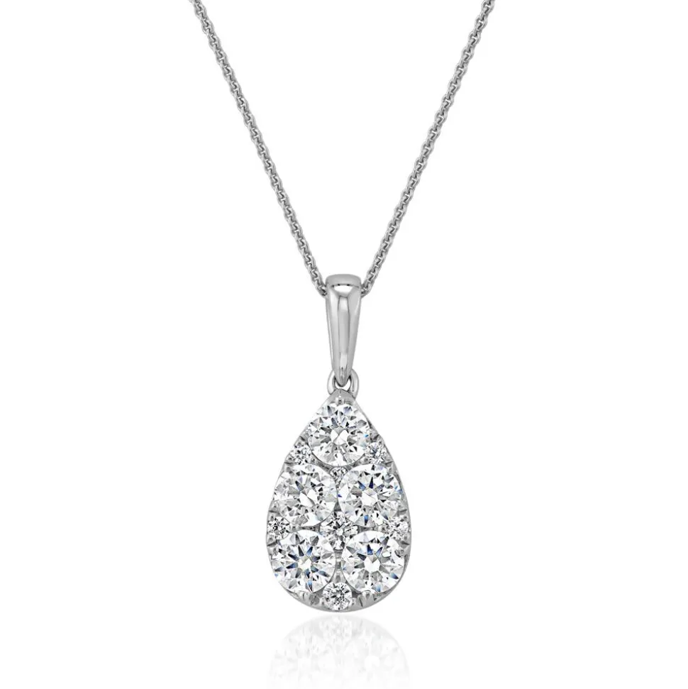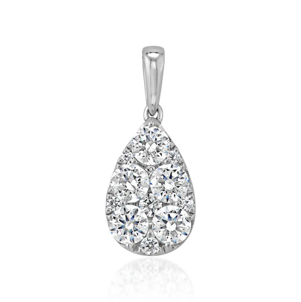 Ein funkelnder Blickfang – das ist dieser tropfenförmige Anhänger für Damen. Er ist entweder in Weißgold (14 Karat oder 18 Karat) oder in 950er Platin erhältlich. Das bevorzugte Material lässt sich über das Drop-down-Feld auswählen. Der Anhänger wird auf der Vorderseite von einem Pavé aus unterschiedlich großen Diamanten geziert. Die 12 Diamanten besitzen insgesamt ca. 0,99 ct. und die Farbe „Top Wesselton“. Ihre Reinheit gehört zur Kategorie „small inclusions“ und ihr Ursprung ist konfliktfrei. Die Dank der großen Öse kann der Anhänger an verschiedenen Ketten getragen werden.