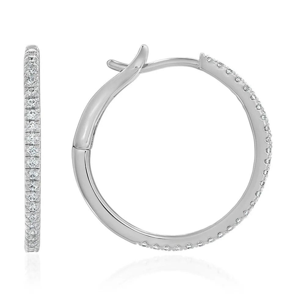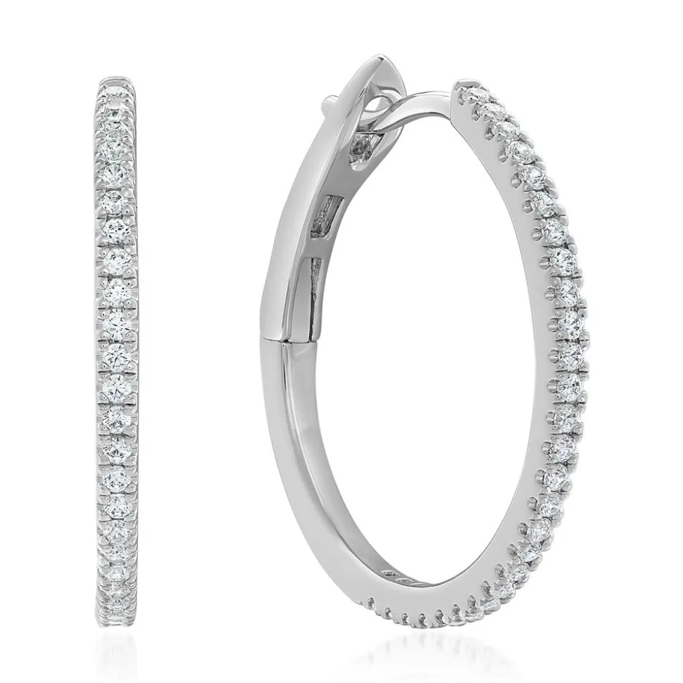 Zeitlos exklusiv – das sind diese Ohrringe für Damen. Im Drop-down-Feld kann die gewünschte Legierung gewählt werden: entweder 585er oder 750er Weißgold oder 950er Platin. Die Creolen sind mit insgesamt 54 brillantgeschliffenen Diamanten (gesamt ca. 0,27 ct.) besetzt. Die Farbe dieser fällt in die Kategorie „Top Wesselton“, die Reinheit ist mit „small inclusions“ klassifiziert und sie stammen selbstverständlich aus konfliktfreien Quellen.