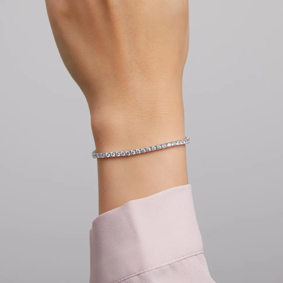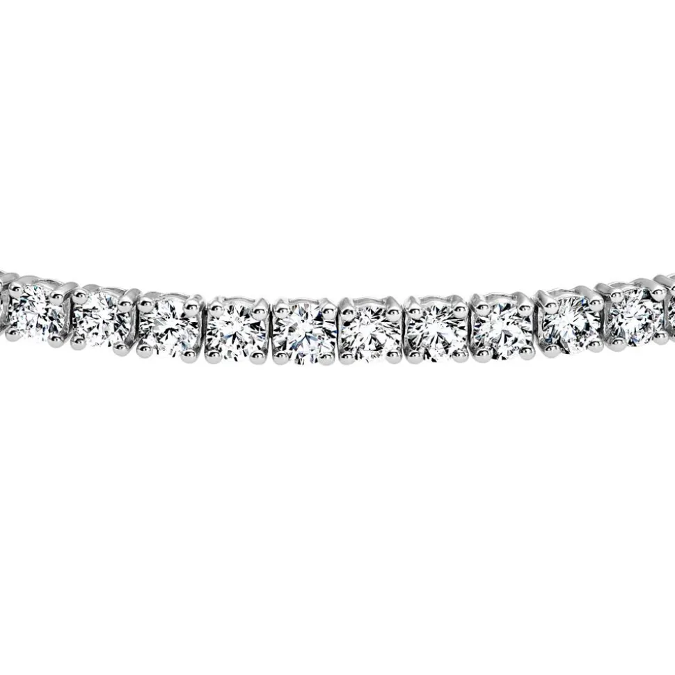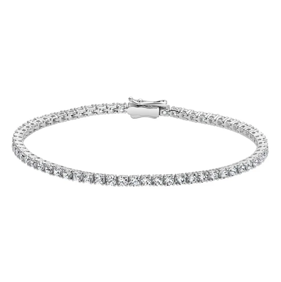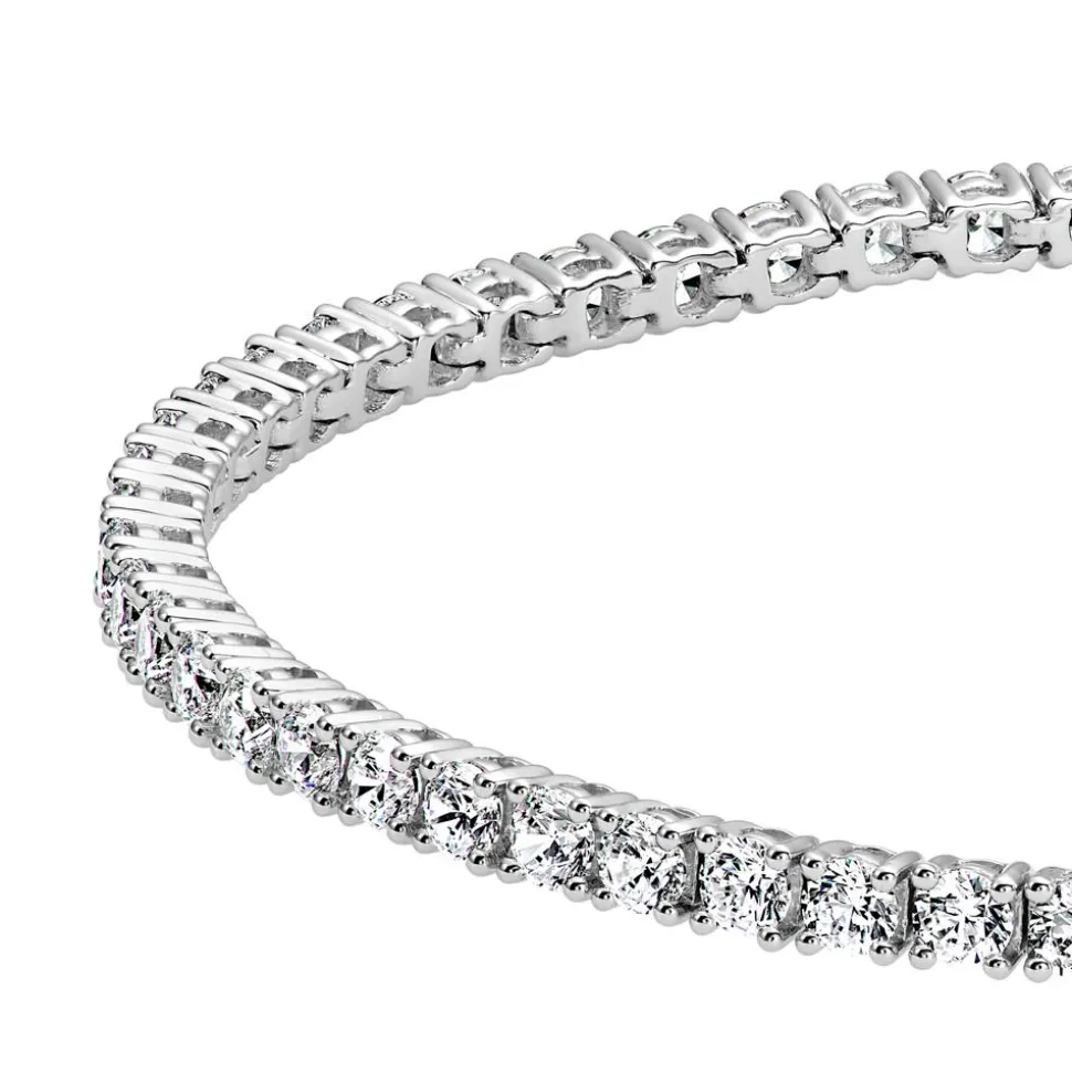 Dieses hochwertige Tennisarmband besticht mit seinem edlen Aussehen. Erhältlich in 585er oder 750er Weißgold sowie in 950er Platin, kann die bevorzugte Legierung über das praktische Drop-down-Feld ausgewählt werden. Jeweils von vier Krappen gehalten, schaffen die 64 Brillanten des Armbands ein funkelndes Zusammenspiel. Die Diamanten mit insgesamt ca. 4,00 ct. haben die Farbe „Feines Weiß“ (Top Wesselton) und die Reinheitskategorie „small inclusions“. Alle Diamanten sind konfliktfrei und stammen aus ethisch verantwortungsvollen Quellen. Für einen hohen Tragekomfort, ist das Armband mit einem Clipverschluss und einen zusätzlichen Sicherheitsbügel versehen.
