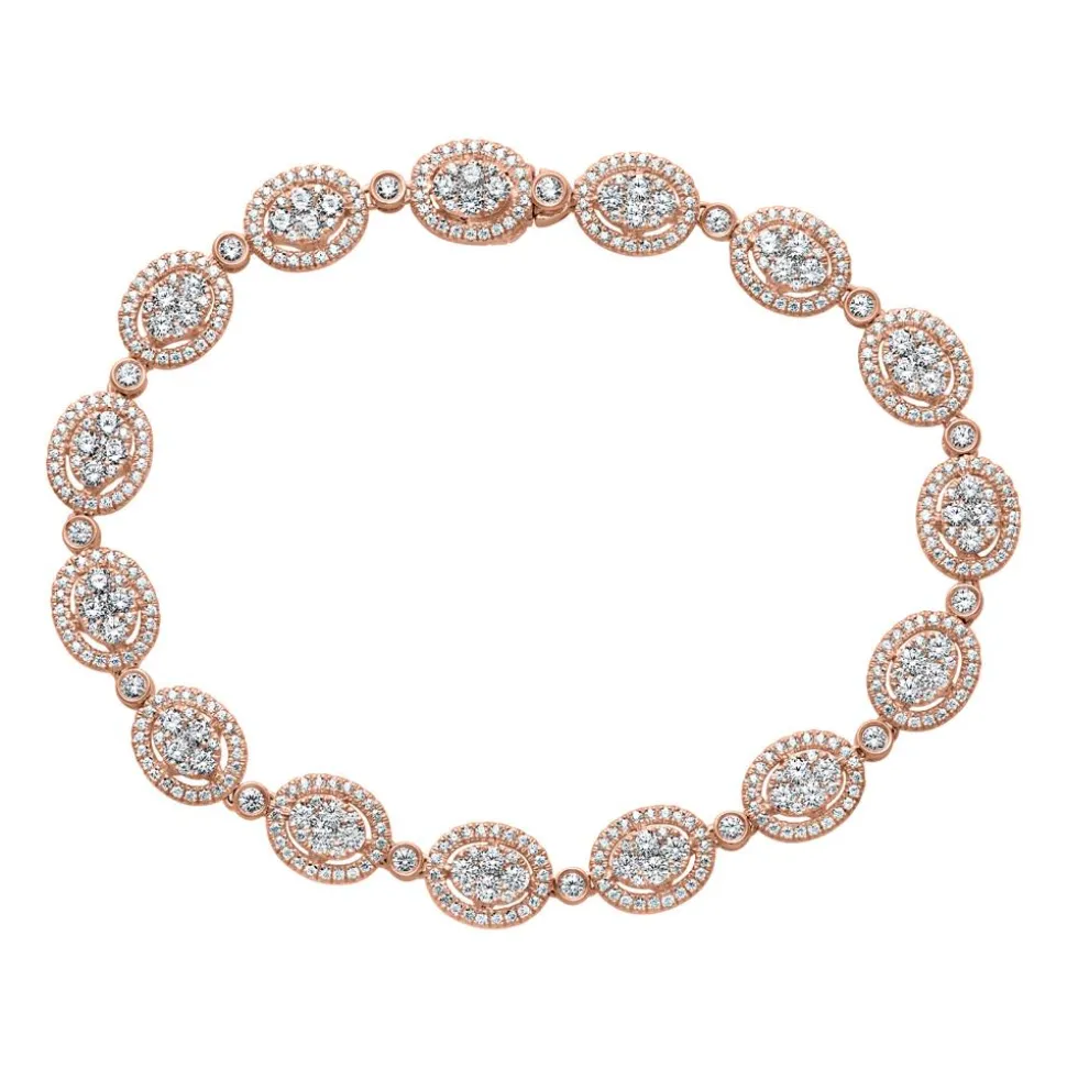 Dieses Diamantarmband für Damen ist ein wahrer Blickfang. Es besteht aus einer Reihe von ovalen Zierelementen im bezaubernden Halo-Design, die abwechselnd mit zargengefassten Diamanten angeordnet sind. Die ovalen Schmuckelemente sind in der Mitte mit jeweils vier großen und vier kleinen Diamanten besetzt, die ein funkelndes Pavé bilden und von einem Kreis kleiner Diamanten umrahmt werden. Insgesamt strahlen 495 Diamanten auf diesem glamourösen Armband. Die Diamanten im Brillantschliff haben zusammen ein Gewicht von etwa 2,81 ct. und verfügen über die Farbe „Feines Weiß“ (Top Wesselton) sowie die Reinheit SI (small inclusions). Da wir zudem auch Wert auf ethische Aspekte legen, stammen unsere Diamanten alle aus konfliktfreien Bezugsquellen. Da das Armband in verschiedenen Legierungen verfügbar ist (585er oder 750er Roségold), kann die gewünschte Legierung über das Drop-down-Feld ausgesucht werden. Um einen guten Halt am Handgelenk zu gewährleisten, ist das Armband mit einem Sicherheitsverschluss versehen. Dieser ist im gleichen Stil gehalten und reiht sich daher perfekt ein.