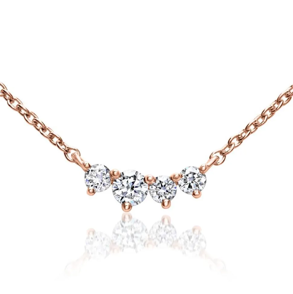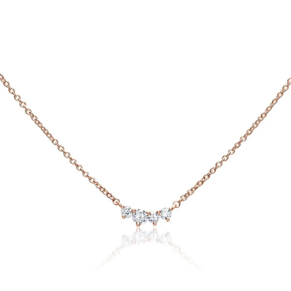 Pure Eleganz – das versprüht diese exklusive Kette für Damen. Sie besteht aus 585er Roségold und ist mit 4 Brillanten (gesamt ca. 0,08 ct., Farbe: G, Reinheit: SI) besetzt, wobei der zweite von links (Draufsicht) etwas größer ist als die anderen. Wir legen bei unserem Diamantschmuck nicht nur Wert auf eine exzellente Qualität, sondern auch auf ethische Aspekte. Deshalb stammen unsere Diamanten ausschließlich aus konfliktfreien Quellen. Die Halskette besitzt einen Federringverschluss und kann in der Länge reguliert werden.