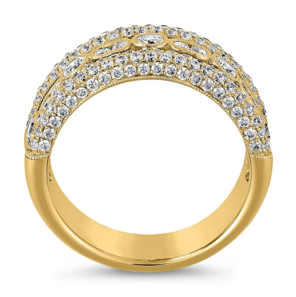 Ein traumhafter Blickfang – das ist dieser Goldring mit Diamantbesatz für Damen. Wahlweise aus 14- oder 18-karätigem Gelbgold gefertigt, kann die gewünschte Legierung ganz einfach über die Drop-down-Liste ausgewählt werden. Der Ring besitzt eine durchbrochene Mitte, in der abwechselnd runde und ovale Fassungen mit Perlierung angeordnet sind. In den runden Fassungen befindet sich ein Diamant und die ovalen Fassungen tragen jeweils zwei. Weitere Diamanten befinden sich in einer Pavéfassung an den Seiten der Ringschiene. Die 151 Brillanten mit insgesamt ca. 1,19 ct. zieren die gesamte vordere Hälfte des Rings. Ihre Farbe ist als „Top Wesselton“ klassifiziert und ihre Reinheit zählt zur Kategorie „small inclusions“. Selbstverständlich stammen alle Diamanten aus konfliktfreien Quellen. Auf Wunsch kann eine Innengravur vorgenommen werden.