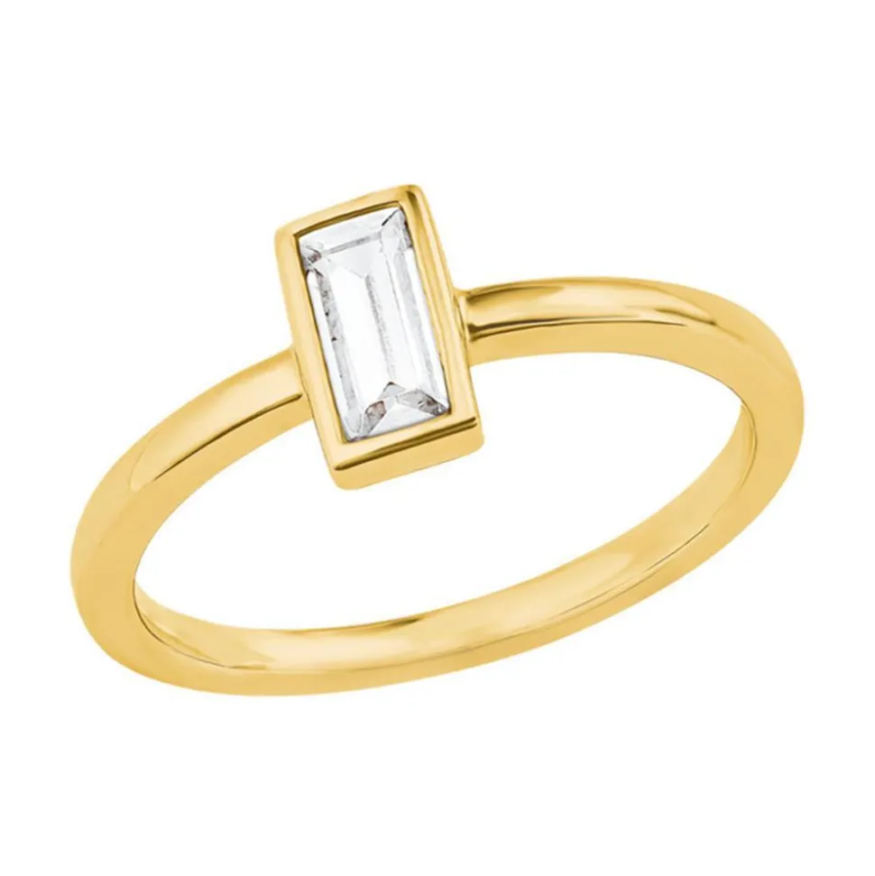 Minimalistische Eleganz – Das versprüht dieser Ring für Damen. Er besteht aus vergoldetem 925er Silber und wird von einem weißen Zirkonia in Baguetteform geziert. Die schmale Ringschiene sorgt für ein angenehmes Tragegefühl.