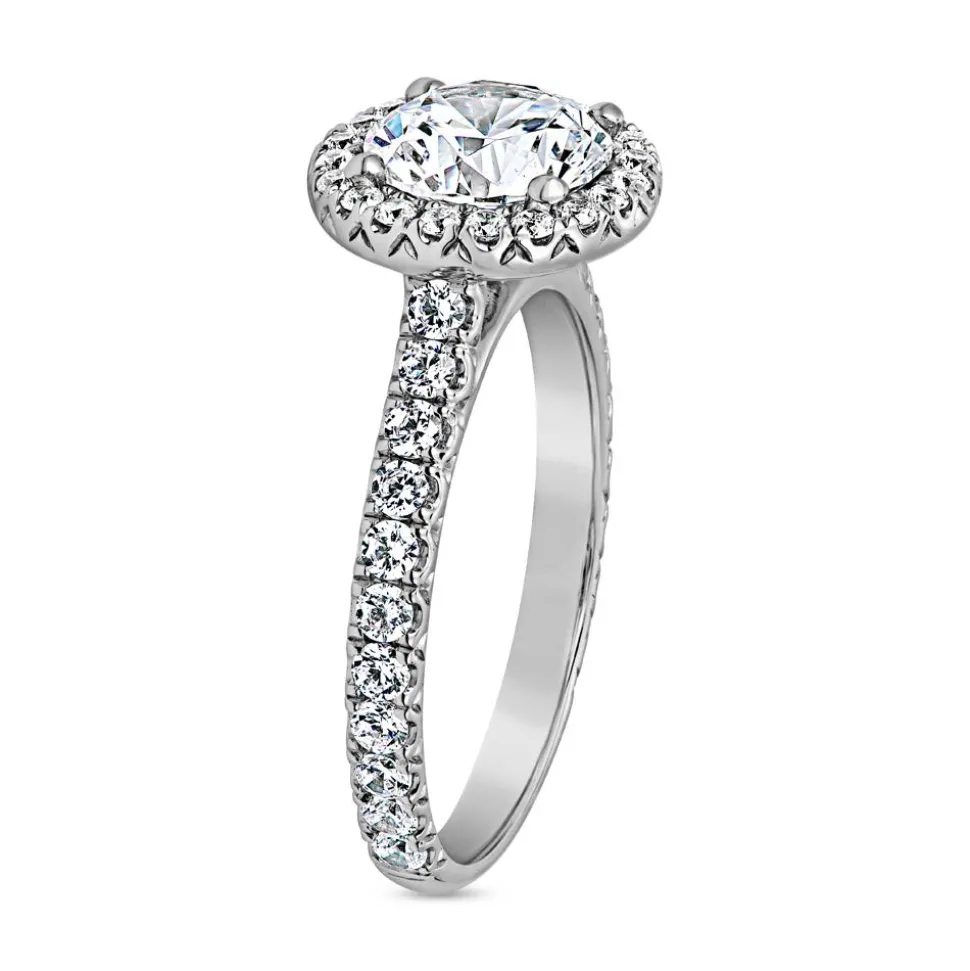 Ein stilvoller Verlobungsring im Halo-Design, der durch die Kombination aus edlen Materialien und erstklassigen lab-grown Diamanten besticht. Der mittige lab-grown Diamant mit ca. 1,50 ct. (G/SI) wird von einem Halo aus funkelnden Diamanten umrahmt, die für ein beeindruckendes Leuchten sorgen. Die Ringschiene wird ebenfalls fast vollständig von laborgezüchteten Diamanten geziert. Insgesamt 42 kleinere lab-grown Brillanten, mit einer Gesamtkaratzahl von ca. 0,64 ct., schmücken den Ring. Jeder der kleineren lab-grown Diamanten verfügt über eine hervorragende Farbe (River bis Top Wesselton) und Reinheit (very, very small inclusions bis very small inclusions). Der Hauptstein ist IGI-zertifiziert, was seine Herkunft und Qualität bestätigt. Der Ring ist wahlweise in 14-karätigem oder 18-karätigem Weißgold sowie in 950er Platin erhältlich und kann auf der Innenseite individuell graviert werden. Die gewünschte Legierung und Gravur lässt sich über das Drop-down-Menü auswählen.