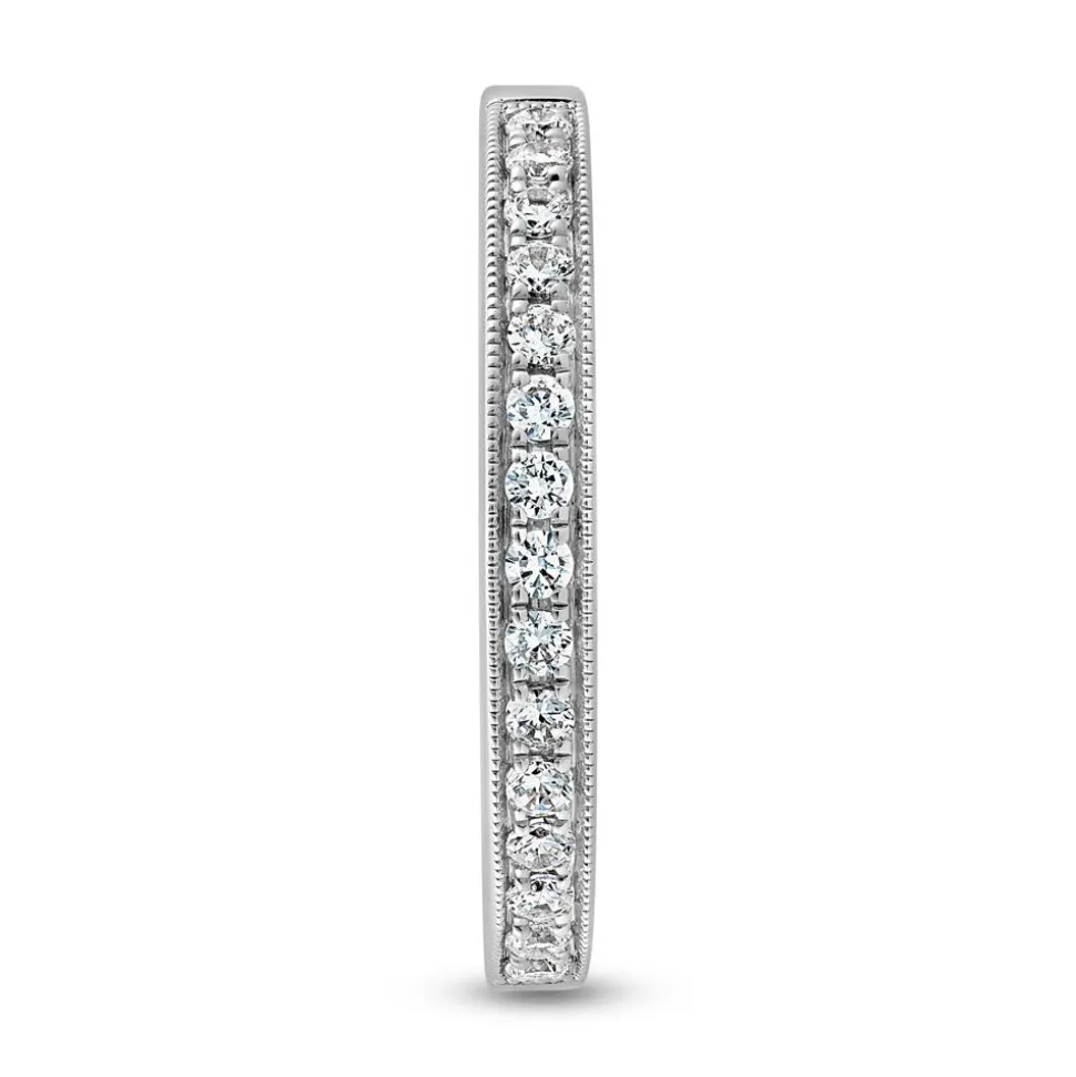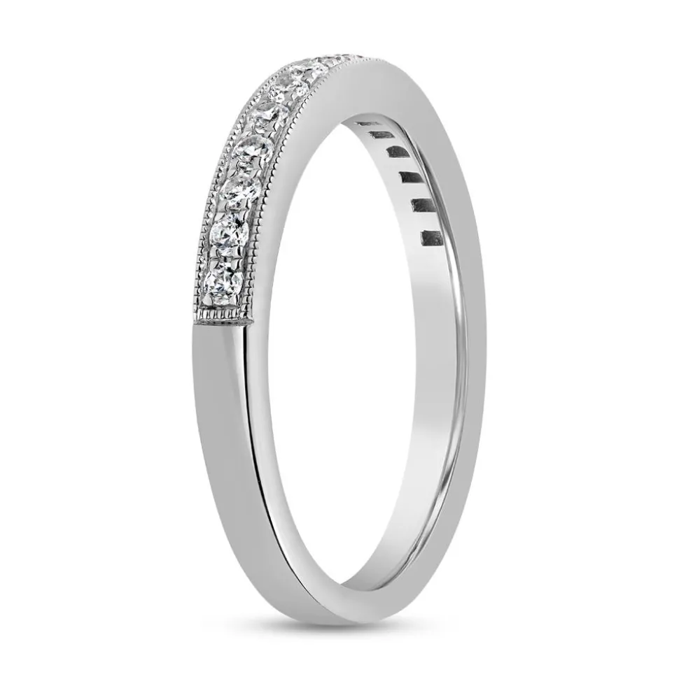 Mit schlichter Eleganz überzeugt dieser Ring für Damen. Wahlweise in Weißgold (585er/750er) oder in 950er Platin erhältlich, ist die gewünschte Legierung bequem über das Drop-down-Menü auswählbar. Auf der Vorderseite des Rings befinden sich 15 laborgezüchtete Diamanten im Brillantschliff (insgesamt ca. 0,24 ct.). Sie sind in die Ringschiene eingelassen und mit Krappen fixiert. Ein Rahmen mit Milgrain-Perlierung umgibt die lab-grown Diamanten. Alle Steine besitzen die Farbe „River“ bis „Top Wesselton“ und eine herausragende Reinheit aus der Kategorie VVS-VS. Durch ihre hochmoderne Fertigung im Labor verfügen die Diamanten über die gleichen wertbestimmenden Eigenschaften wie natürliche Diamanten und sind zudem noch umweltfreundlicher. Auf Wunsch kann die Innenseite des Rings individuell graviert werden, um ihm eine persönliche Note zu verleihen.