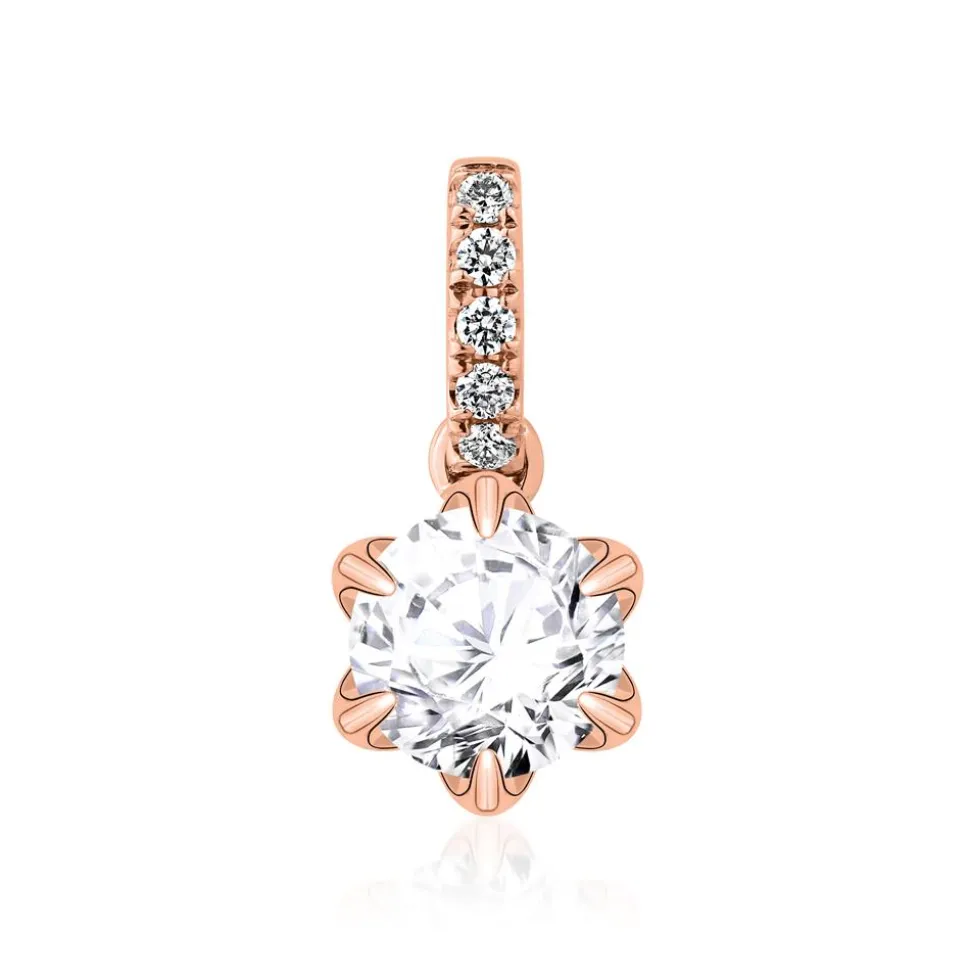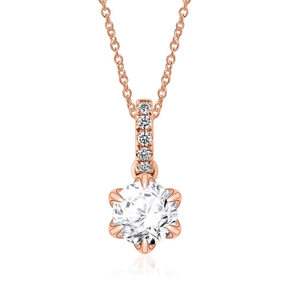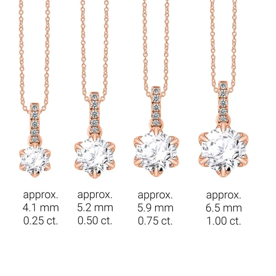 Ein exklusiver Eyecatcher – das ist dieser Kettenanhänger aus 585er Roségold. Die blütenförmige Krappenfassung ist mit einem brillantgeschliffenen Diamant (wahlweise in 0,25 ct./0,50 ct./0,75 ct. oder 1,00 ct.; Farbe: G ; Reinheit: SI) besetzt. Bitte das gewünschte Steingewicht im Drop-down-Feld auswählen. Ab 0,50 ct. liegt der Bestellung ein GIA-Zertifikat bei. Dieses gibt Auskunft über die Herkunft, Echtheit und alle weiteren wertbestimmenden Merkmale. Die Öse wird von 5 Brillanten (gesamt ca. 0,04 ct.; G/SI) geziert. Für uns ist es selbstverständlich, dass wir unsere Diamanten ausschließlich aus konfliktfreien Quellen beziehen. Optional kann in einem weiteren Drop-down-Feld eine Kette in verschiedenen Längen hinzu gebucht werden.