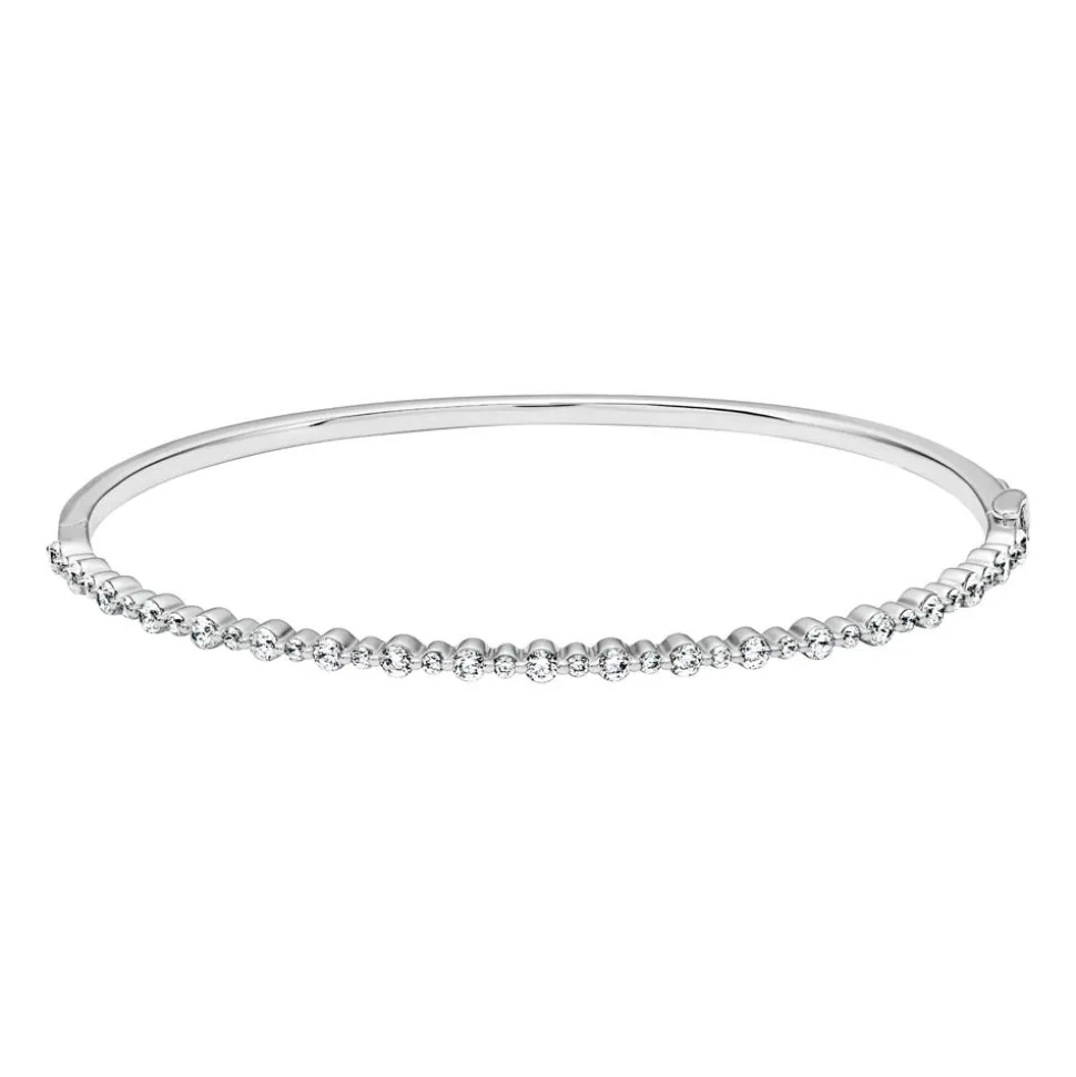 Wunderschön elegant – das ist dieser Armreif für Damen. Er ist in 14-karätigem oder 18-karätigem Weißgold sowie in 950er Platin erhältlich. Die Drop-down-Liste ermöglicht eine freie Auswahl der gewünschten Legierung. Unterschiedlich große Diamanten in Zargenfassungen wechseln sich auf der Oberseite des Armreifs ab und sorgen für ein bezauberndes Funkeln. Die 37 brillantgeschliffenen Diamanten verfügen insgesamt über ca. 0,93 ct. (Farbe: TW, Reinheit: SI) und stammen aus konfliktfreien Quellen. Der Armreif ist aufklappbar und lässt sich somit bequem an- und ablegen. Er wird mit einem Clipverschluss geschlossen, der für noch mehr Sicherheit einen zusätzlichen Bügel besitzt. Gerne fügen unsere erfahrenen Graveure noch eine individuelle Botschaft auf der hinteren Innen- oder Außenseite des Armreifs hinzu.