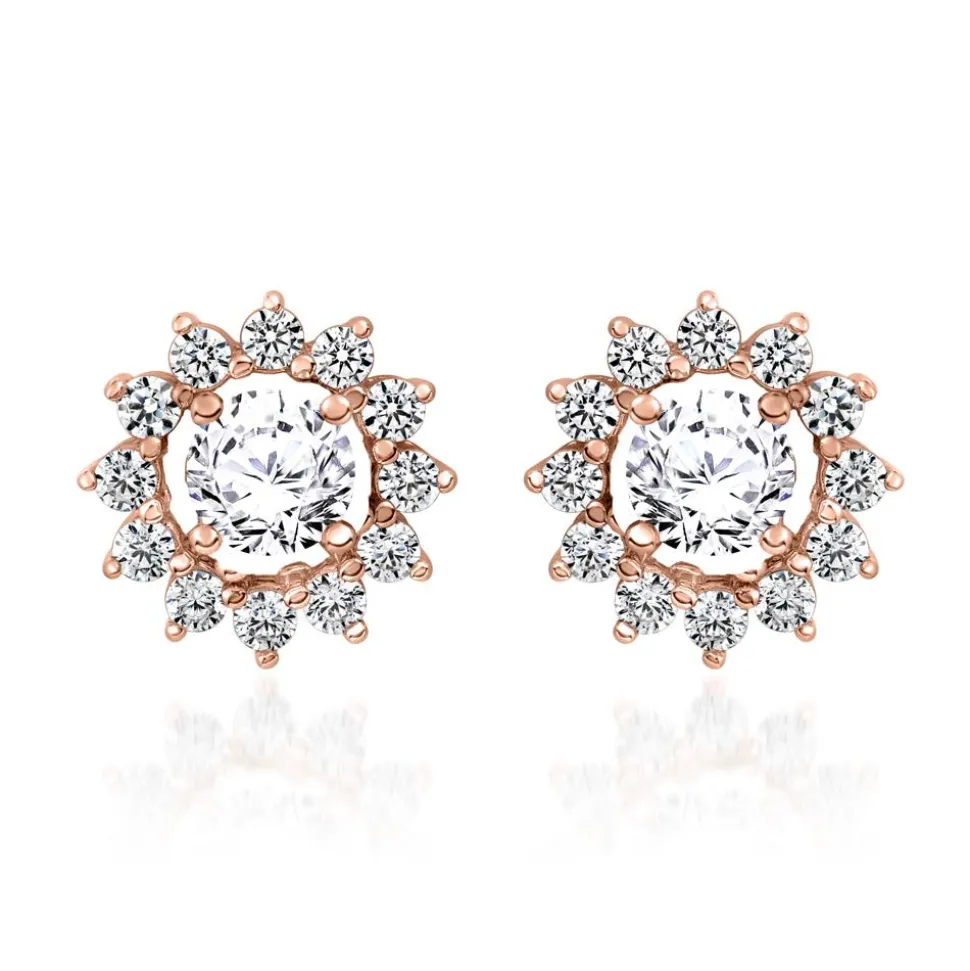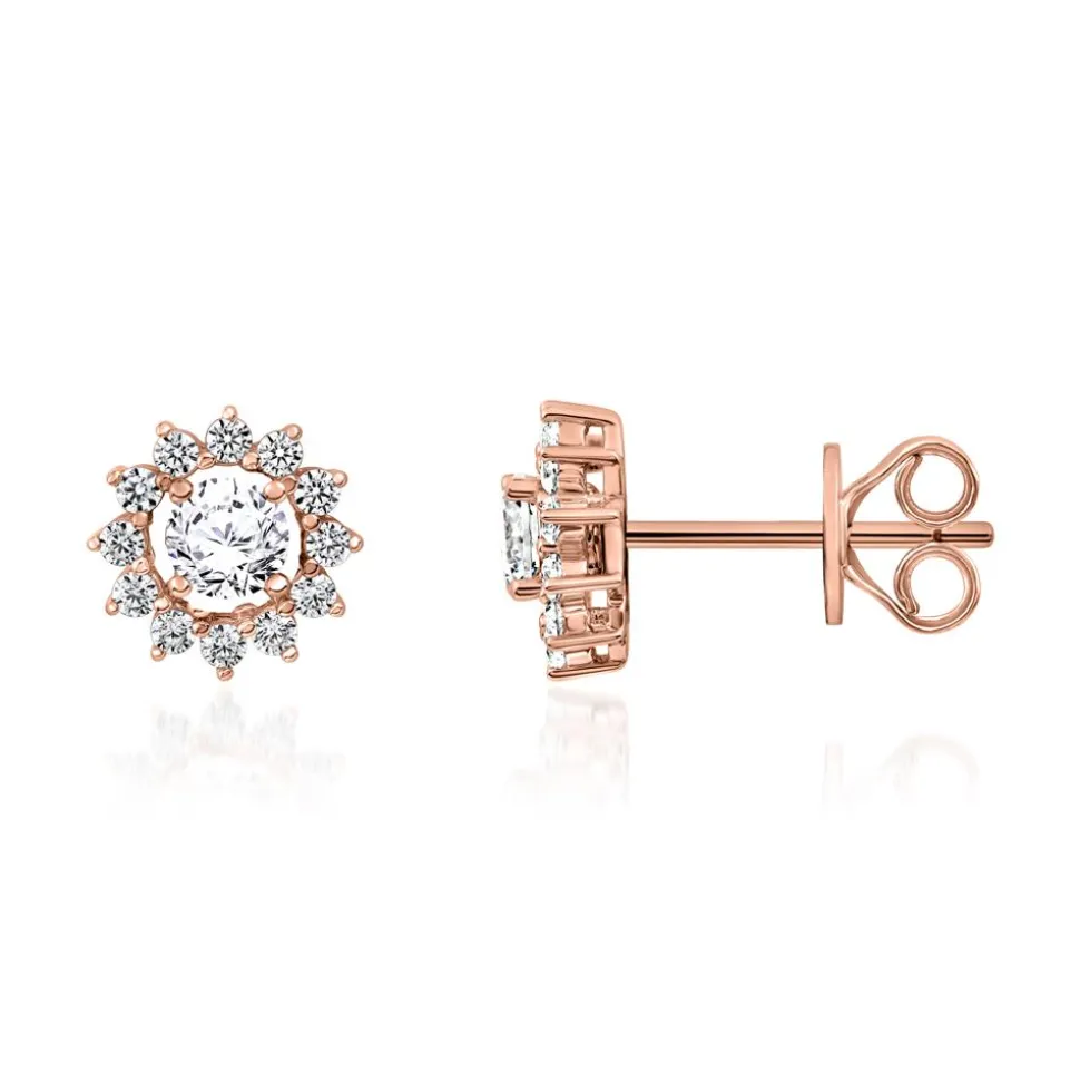 Traumhaft feminin – das sind diese roségoldenen Ohrstecker für Damen. Wahlweise in einer 14 Karat oder 18 Karat Roségoldlegierung erhältlich, begeistern sie mit einem eleganten Blüten-Design. Die Auswahl der Legierung erfolgt über das Drop-down-Feld. Die Damenohrstecker bestehen aus mehreren laborgezüchteten Diamanten in der Farbe „River“ bis „Top Wesselton“ und der Reinheit „very, very small inclusions“ bis „very small inclusions“. Im Zentrum der Ohrstecker befindet sich jeweils ein ca. 0,30 ct. schwerer Brillant, der von einem herausnehmbaren Rahmen mit weiteren Diamanten umgeben ist. Die 12 Brillanten auf dem Rahmen verfügen zusammen über ca. 0,21 ct. und werden jeweils von drei Krappen gehalten. Die Diamanten bestehen ebenfalls aus 100 % Kohlenstoff und unterscheiden sich auch in Bezug auf ihre Härte und ihr Funkeln nicht von natürlichen Diamanten.
