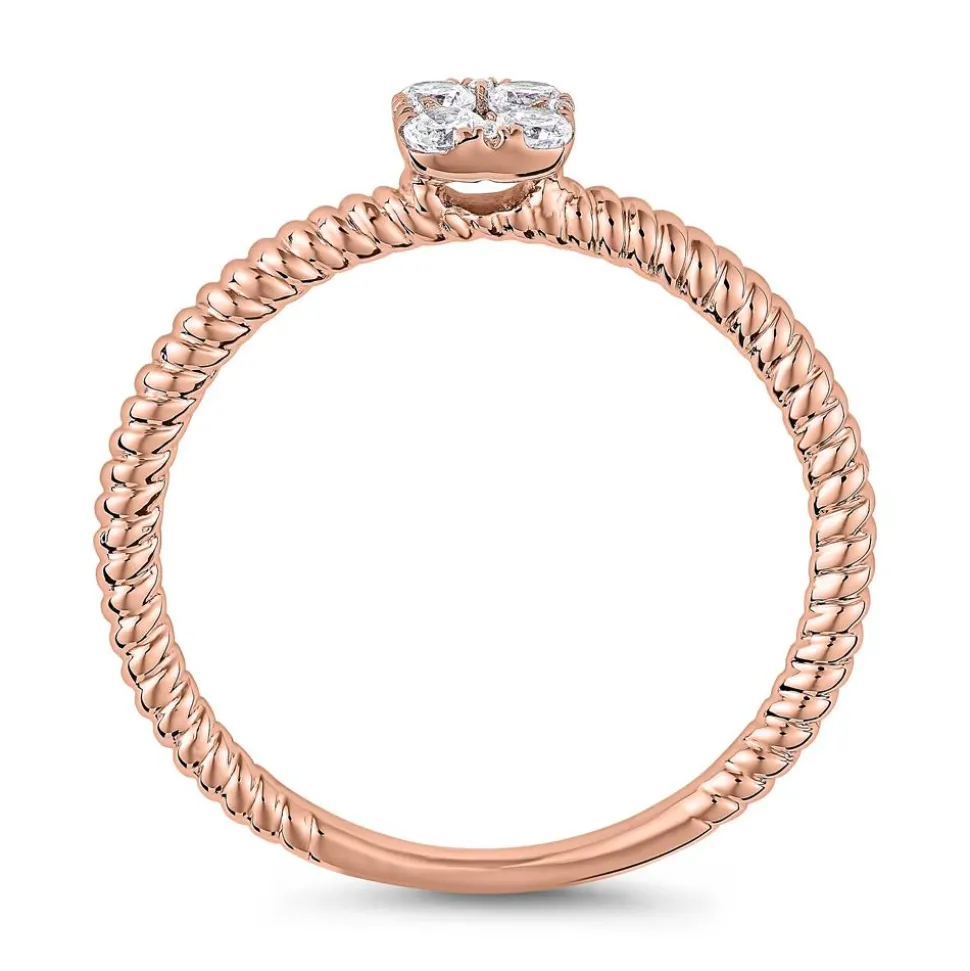 Dieser Ring für Damen besteht entweder aus 585er oder 750er Roségold und begeistert mit seiner modernen Kordel-Optik. Blickfang des Rings ist der quadratische Ringkopf mit abgerundeten Ecken. Auf diesem sind 4 große Diamanten (ca. 0,15 ct. gesamt) und 5 kleinere Diamanten (ca. 0,02 ct. gesamt) eingefasst. Jeder Diamant besitzt einen Brillantschliff und zeichnet sich durch die Reinheit „small inclusions“ und die Farbe „Top Wesselton“ aus. Zudem verfügen unsere Diamanten über einen konfliktfreien Ursprung. Über das praktische Drop-down-Feld kann die Auswahl der Legierung vorgenommen werden.