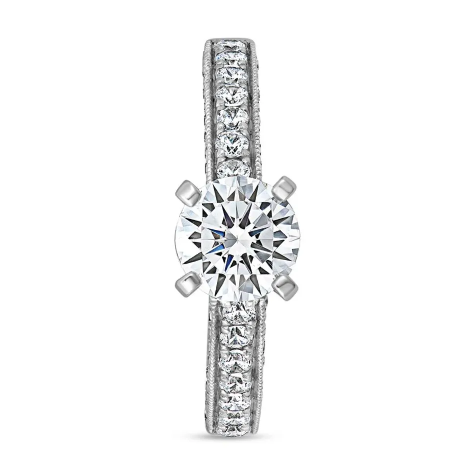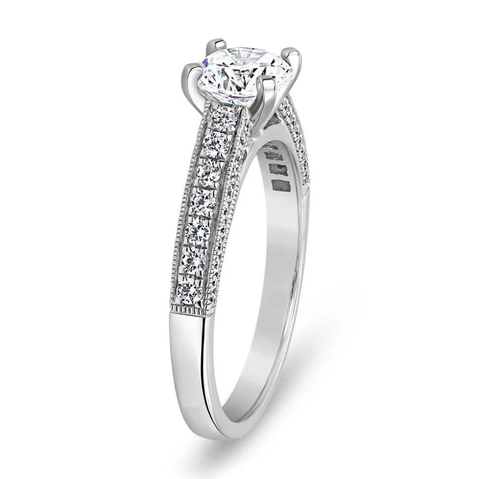 Dieser Verlobungsring für Damen ist Ausdruck von wunderschöner Handwerkskunst. Er besteht entweder aus 14-karätigem oder 18-karätigem Weißgold oder aus 950er Platin. Die Auswahl der Legierung kann über das Drop-down-Feld getroffen werden. Blickfang des Rings ist der funkelnde Brillant in der Chatonfassung (ca. 0,70 ct.). Dieser thront auf der Ringschiene und wird an den Seiten von diamantbesetzten Bögen begleitet. Insgesamt zieren 58 Diamanten (ca. 0,40 ct. gesamt) die vordere Hälfte des Rings. Sein kantiges Profil wird noch durch eine stilvolle Milgrain-Perlierung hervorgehoben, die die Diamanten an den Außenkanten umgibt. Jeder Diamant ist brillantgeschliffen und verfügt über die Reinheit SI (small inclusions) sowie die Farbe TW (Top Wesselton). Informationen zu allen wertbestimmenden Merkmalen des Haputdiamanten befinden sich zudem in dem beigefügten Zertifikat des Gemological Institute of America (GIA). Uns ist es wichtig, dass unsere Diamanten neben hohen Qualitätskriterien, auch ethischen Kriterien entsprechen. Deshalb beziehen wir unsere Diamanten ausschließlich aus konfliktfreien Quellen. Auf Wunsch gravieren unsere erfahrenen Graveure noch eine persönliche Widmung (ein Name oder Datum) auf die Innenseite des Rings.