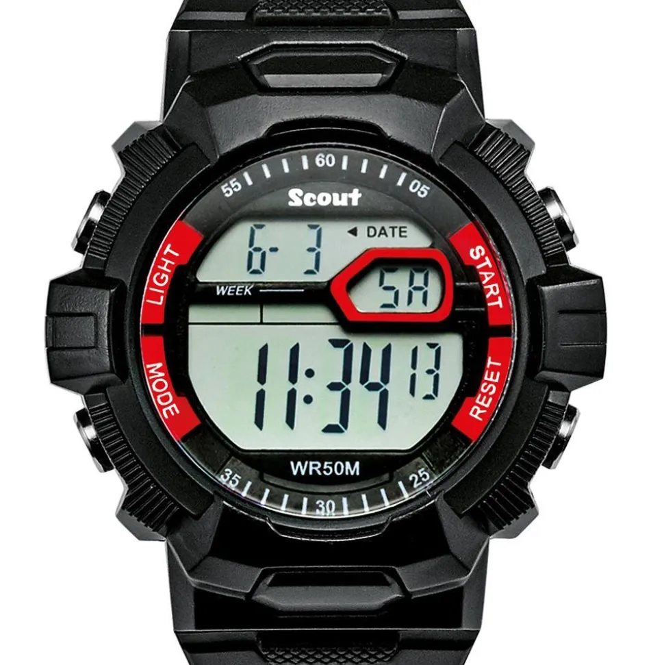 Ein praktischer Begleiter – das ist diese Digitaluhr für Kinder. Die Uhr mit batteriebetriebenem Quarzantrieb verfügt über eine digitale Anzeige der Uhrzeit, des Datums und des Wochentags. Zudem besitzt sie eine Alarm-, Stopp- und Beleuchtungsfunktion. Das Gehäuse und Armband der Uhr bestehen aus schwarzem Kunststoff. Der Gehäuseboden ist aus Edelstahl. Die Funktion der vier Druckknöpfe ist auf dem Display in roter Farbe hervorgehoben. Das weiche Armband wird mit einer bequemen Dornschließe geschlossen und kann an das jeweilige Handgelenk angepasst werden. Zudem ist die Armbanduhr bis zu einem Druck von 5 bar wasserfest und eignet sich daher hervorragend zum Spielen und Toben.