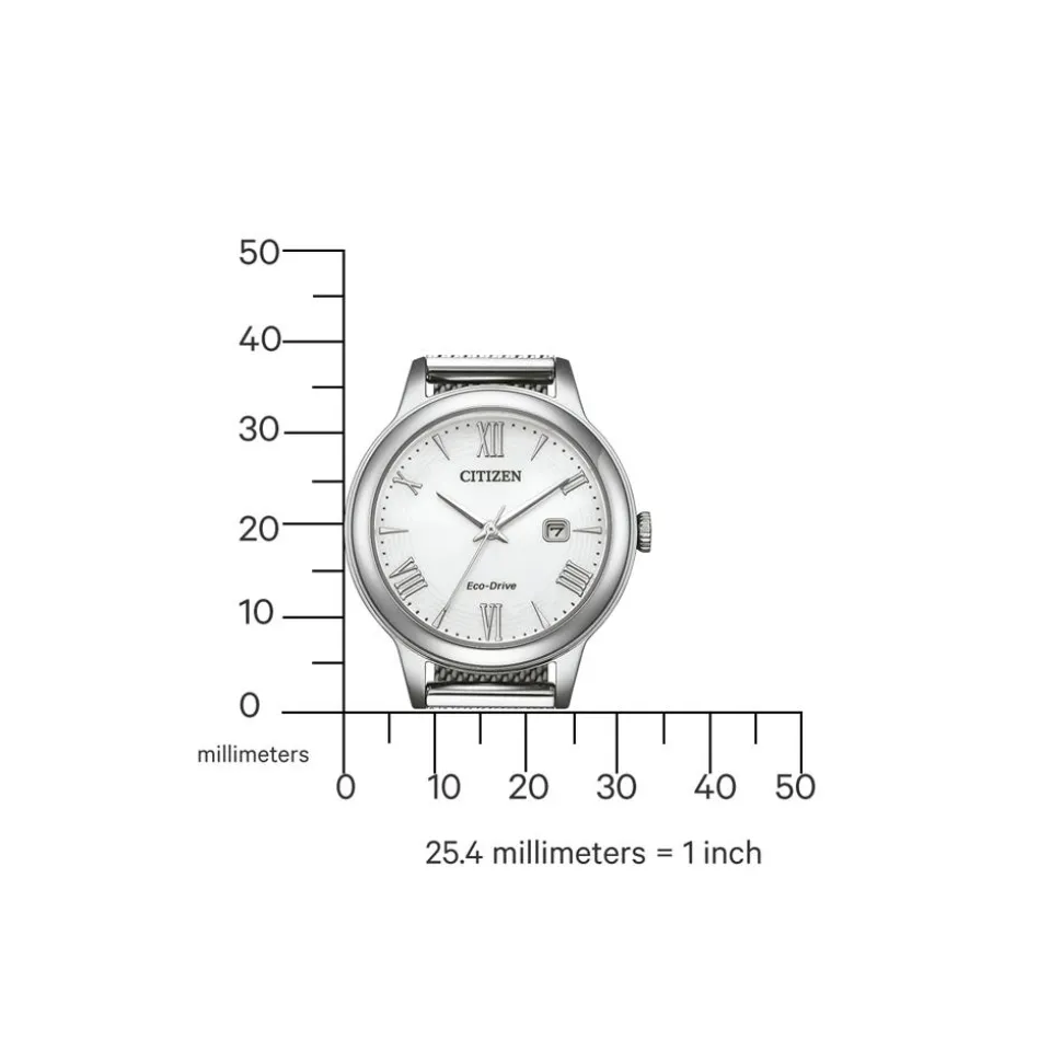 Für schlichte Eleganz steht diese Uhr für Damen. Sie verfügt über ein solarbetriebenes Quarzuhrwerk mit einer Gangreserve von 180 Tagen. Die Uhr ist aus Edelstahl gefertigt und besitzt ein weißes Zifferblatt. Dieses wird von Kristallglas geschützt und ist mit drei Zeigern, römischen Ziffern und einer Datumsanzeige versehen. Das Milanaiseband der Uhr schließt mit einem Klappverschluss. Das Uhrengehäuse ist bis zu einem Druck von 10 bar wasserfest.