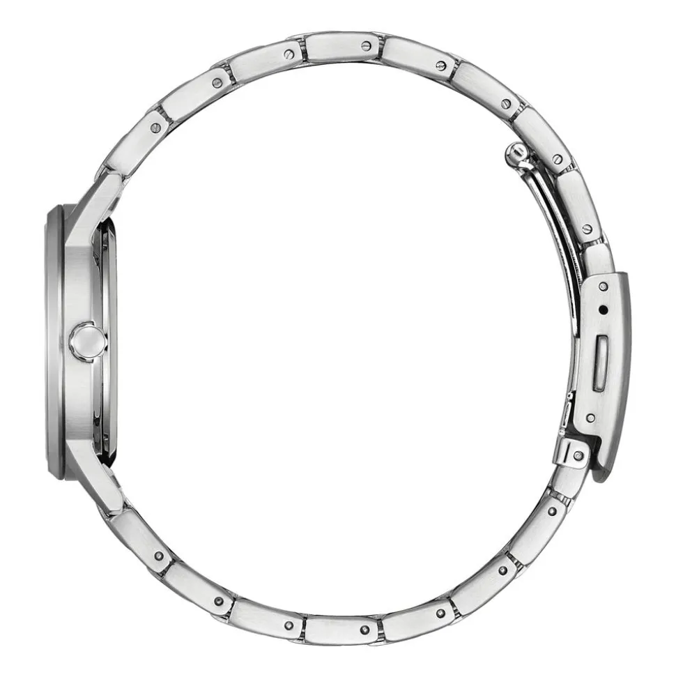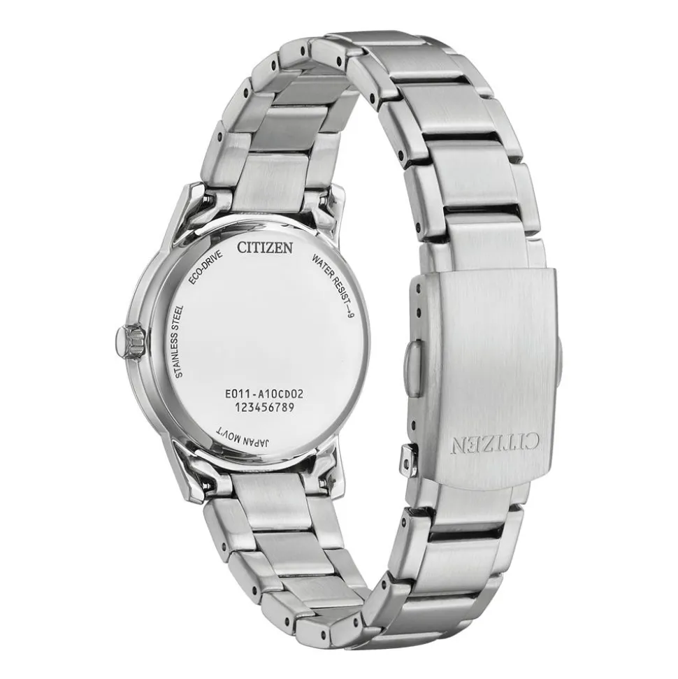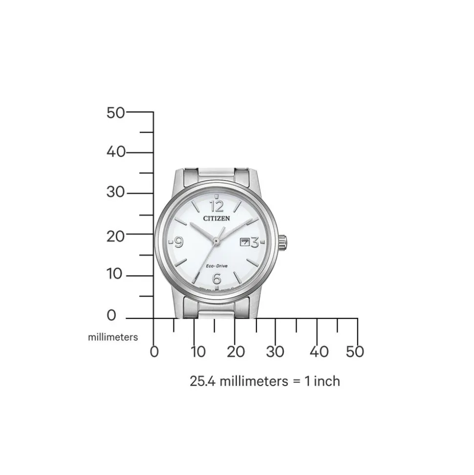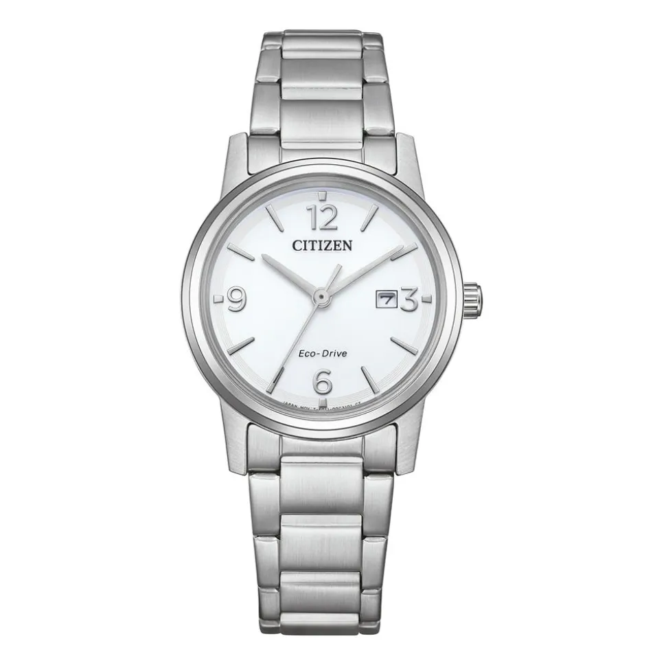 Ein perfekter Begleiter für den Alltag – das ist diese Armbanduhr aus mattem Edelstahl. Sie besitzt ein zuverlässiges Quarzuhrwerk, welches mit Eco-Drive Technologie ausgestattet ist. Diese nutzt einfallendes Licht und verfügt über eine Gangreserve von 180 Tagen. Das weiße Zifferblatt ist schlicht gehalten und besitzt neben arabischen Zahlen und Strichindizes noch eine Datumsanzeige. Ein Gliederarmband mit Faltschließe hält die Uhr. Sie ist bis zu einem Druck von 3 bar wasserdicht.