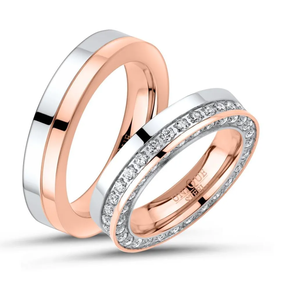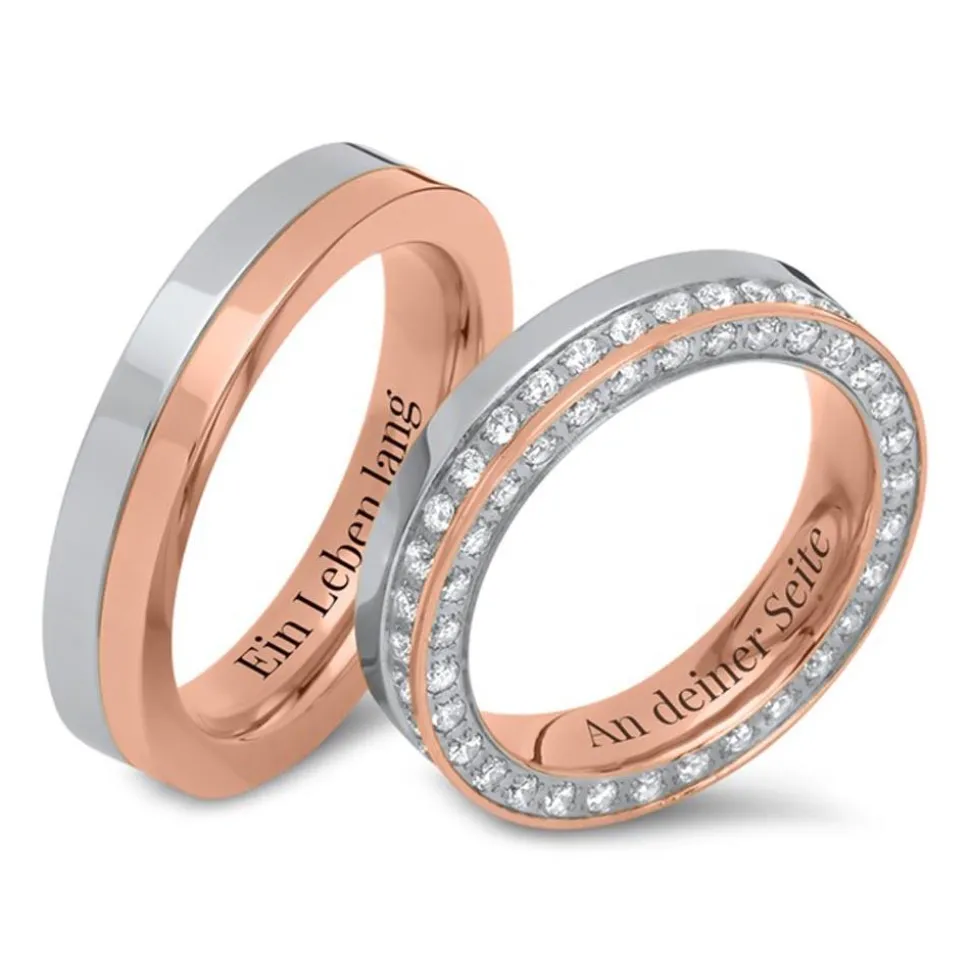 Silberne Eheringe oder doch lieber roségoldene? Wer sich nicht entscheiden kann, der findet mit diesen zweifarbigen Edelstahl-Ringen den passenden Kompromiss. Ein Teil der auf Hochglanz polierten Ringe glänzt in der Farbe Silber, ein anderer Teil in der Farbe Roségold. Roségold macht dabei den größeren Anteil aus. Ein zusätzlicher Clou ist der Zirkonia-Besatz in der Mitte und auf einer Seite des Damenrings.