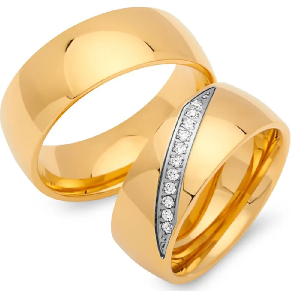 Exklusive vergoldete Edelstahl Eheringe in 8mm Breite. Die angebotenen Edelstahl Trauringe sind von Innen abgerundet, wodurch sie sich sehr angenehm tragen lassen. Das Angebot bezieht sich auf beide Eheringe und beinhaltet ein Gratis-Etui. Die Ringe können auch als Verlobungsringe, Partnerringe oder Freundschaftsringe getragen werden.