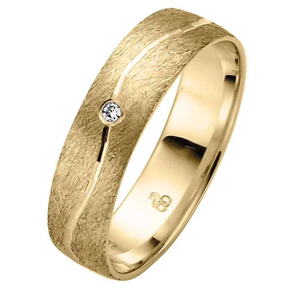 Das einmalige Design dieser Eheringe sorgt für Begeisterung. Die Ringe sind aus Gold gefertigt und stammen aus der „Easy Line – New Generation“-Kollektion von Rauschmayer. Ihre Oberfläche besitzt eine eisgekratzte Struktur und wird jeweils von einer facettierten geschwungenen Rille geziert. Auf dem Damenring befindet sich noch ein funkelnder Diamant im Brillantschliff. Der Brillant besitzt ca. 0,01 ct. und zeichnet sich durch eine hohe Qualität aus (Farbe: Top Wesselton, Reinheit: small inclusions, konfliktfreier Ursprung). Dank der inneren Bombierung (Abrundung) verfügen die Ringe über äußerst angenehme Trageeigenschaften. Ihre Innenseite kann auf Wunsch mit einer individuellen Widmung graviert werden.