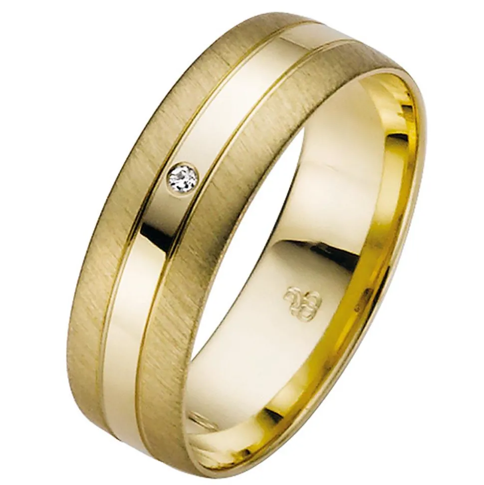 Traumhaft elegant – das sind diese exklusiven Eheringe aus Gold. Sie gehören zu der „Easy Line – New Generation“-Kollektion von Rauschmayer und zeichnen sich durch ein erstklassiges Design aus. In der Mitte der Ringe befindet sich ein hochglanzpolierter Streifen, der auf beiden Seiten von jeweils einer Rille begleitet wird. Die Seiten der Ringe besitzen eine schräg-gebürstete Oberfläche. Auf dem Damenring funkelt ein ca. 0,01 ct. schwerer Diamant im Brillantschliff. Seine Farbe ist als „Wesselton“ klassifiziert und die Reinheit stammt aus der Kategorie „Piqué II“. Weiterhin besitzt der Diamant einen konfliktfreien Ursprung. Angenehm zu tragen sind die Ringe dank ihrer inneren Bombierung. Auf Wunsch kann noch eine Innengravur hinzugefügt werden.
