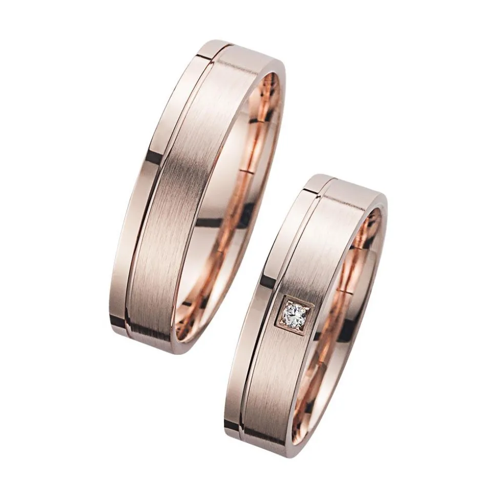 Trauringe in Rotgold mit einer feinmatten und hochglanzpolierten Oberfläche, einer Stärke von 1,3 mm und einer Breite von 5 mm. Die Ringe sind bombiert (abgerundet) und die äußere Ringform ist flach. Der Damenring wird von einem Brillant 1x 0,02 ct. geziert. Die Farbe ist klassifiziert als H – Weiß (Wesselton) und die Reinheit der Steine fällt in die Kategorie SI – small inclusions. Bei uns wird Qualität groß geschrieben. Daher prüfen wir jeden einzelnen Ring, bevor er unser Haus verlässt. Da uns auch ethische Aspekte am Herzen liegen, verarbeiten wir ausschließlich Diamanten aus konfliktfreien Quellen. Die Ringe sind rhodiniert und somit anlaufgeschützt. Zudem können sie graviert werden – perfekt für liebevolle Botschaften.