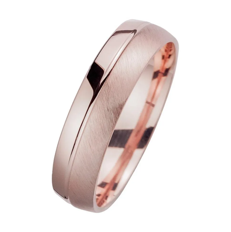 Trauringe in Rotgold mit einer schrägfeinmatten und hochglanzpolierten Oberfläche, einer Stärke von 1,4 mm und einer Breite von 5,5 mm. Die Ringe sind bombiert (abgerundet) und die äußere Ringform ist rund. Der Damenring wird von mehreren Brillanten 3x 0,015 ct. geziert. Die Farbe ist klassifiziert als H – Weiß (Wesselton) und die Reinheit der Steine fällt in die Kategorie SI – small inclusions. Bei uns wird Qualität groß geschrieben. Daher prüfen wir jeden einzelnen Ring, bevor er unser Haus verlässt. Da uns auch ethische Aspekte am Herzen liegen, verarbeiten wir ausschließlich Diamanten aus konfliktfreien Quellen. Die Ringe sind rhodiniert und somit anlaufgeschützt. Zudem können sie graviert werden – perfekt für liebevolle Botschaften.