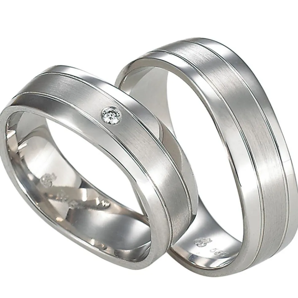 Ein gradliniges Design zeichnet diese Eheringe aus Weißgold aus. In der Mitte der polierten Ringe befindet sich ein matter Streifen, der auf jeder Seite von einer Glanzrille begleitet wird. Für ansprechendes Funkeln sorgt der Brillant auf dem Damenring (ca. 0,02 ct., Farbe W, Reinheit SI, konfliktfrei). Die Ringe aus der Pair-Kollektion von Rauschmayer sind innen bombiert (abgerundet) und besitzen daher ein komfortables Tragegefühl. Mit einer Gravur auf der Innenseite können die Ringe noch individuell gestaltet werden.