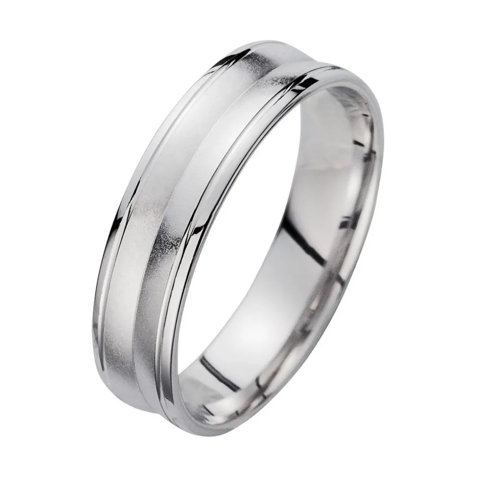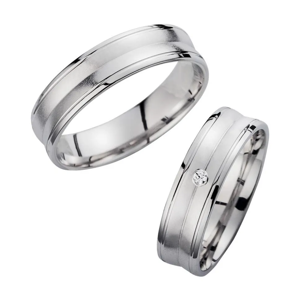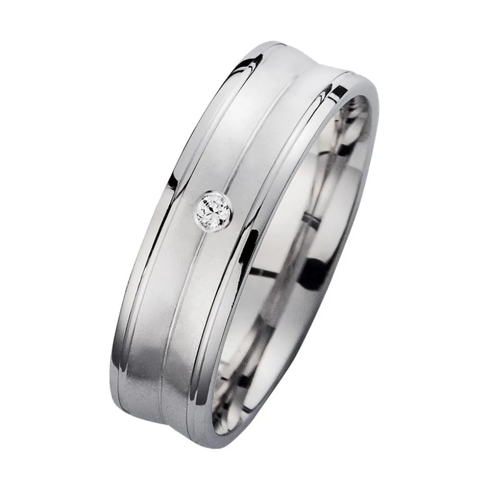 Trauringe in Weißgold mit einer sandmatten und hochglanzpolierten Oberfläche, einer Stärke von 1,2 mm und einer Breite von 5,5 mm. Die Ringe sind bombiert (abgerundet) und die äußere Ringform ist konkav. Der Damenring wird von einem Brillant 1x 0,02 ct. geziert. Die Farbe ist klassifiziert als H – Weiß (Wesselton) und die Reinheit der Steine fällt in die Kategorie SI – small inclusions. Bei uns wird Qualität groß geschrieben. Daher prüfen wir jeden einzelnen Ring, bevor er unser Haus verlässt. Da uns auch ethische Aspekte am Herzen liegen, verarbeiten wir ausschließlich Diamanten aus konfliktfreien Quellen. Die Ringe sind rhodiniert und somit anlaufgeschützt. Zudem können sie graviert werden – perfekt für liebevolle Botschaften.