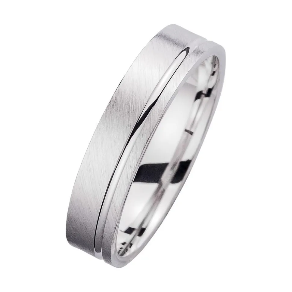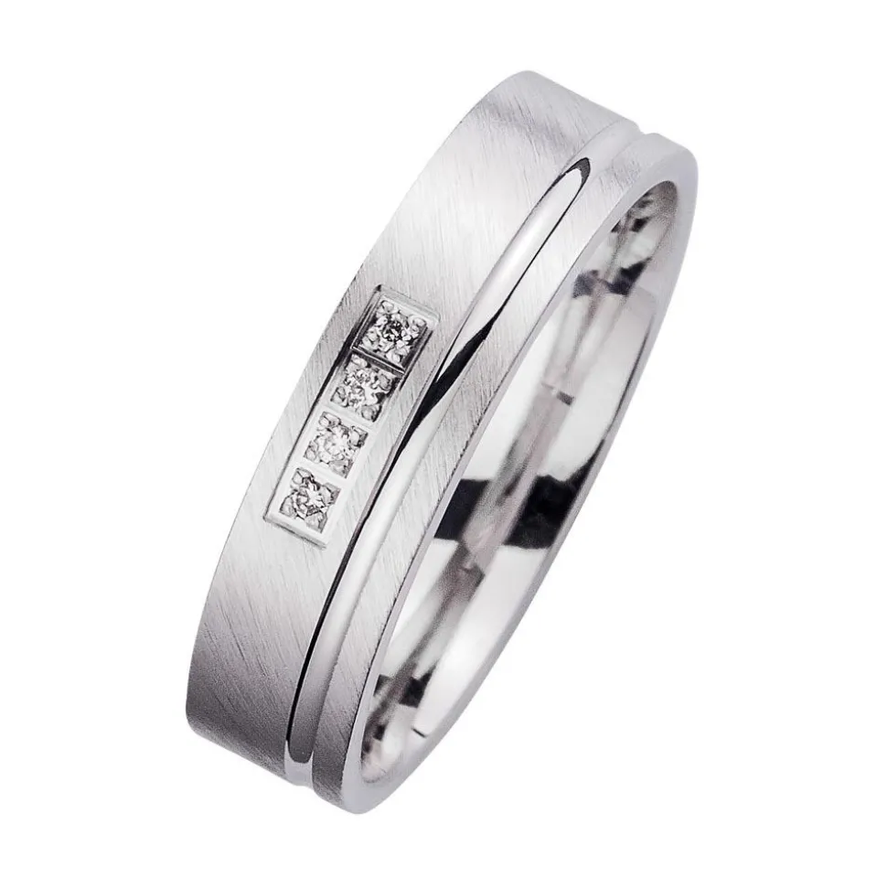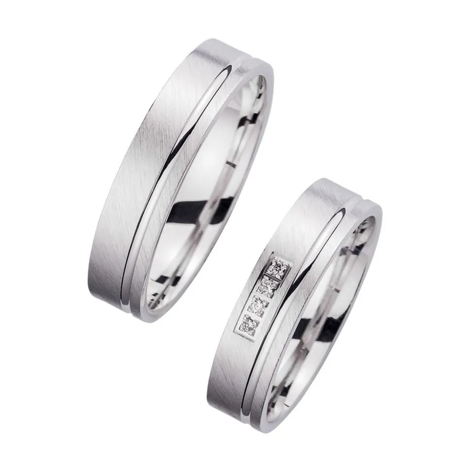 Trauringe in Weißgold mit einer schrägfeinmatten und hochglanzpolierten Oberfläche, einer Stärke von 1,3 mm und einer Breite von 5 mm. Die Ringe sind bombiert (abgerundet) und die äußere Ringform ist flach. Der Damenring wird von mehreren Brillanten 4x 0,005 ct. geziert. Die Farbe ist klassifiziert als H – Weiß (Wesselton) und die Reinheit der Steine fällt in die Kategorie SI – small inclusions. Bei uns wird Qualität groß geschrieben. Daher prüfen wir jeden einzelnen Ring, bevor er unser Haus verlässt. Da uns auch ethische Aspekte am Herzen liegen, verarbeiten wir ausschließlich Diamanten aus konfliktfreien Quellen. Die Ringe sind rhodiniert und somit anlaufgeschützt. Zudem können sie graviert werden – perfekt für liebevolle Botschaften.
