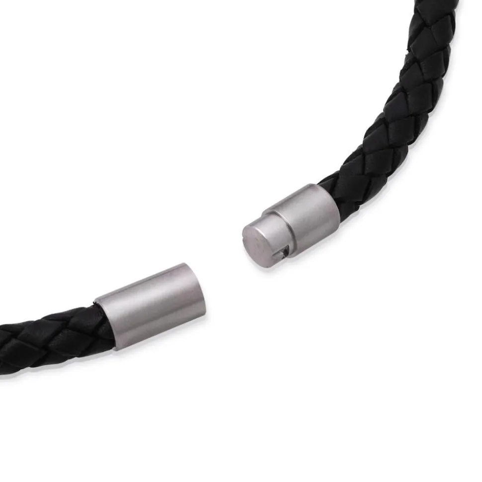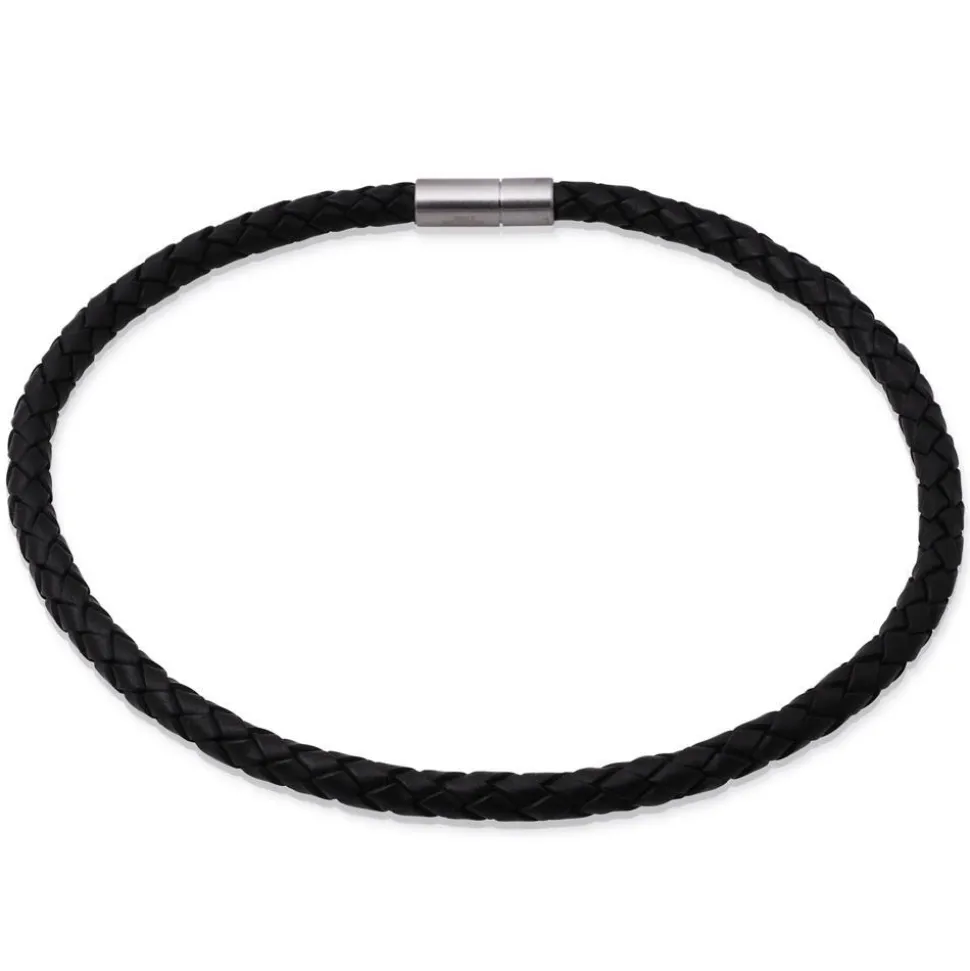 Moderne geflochtene Kette aus schwarzem Leder mit praktischem Edelstahlschnellverschluß.