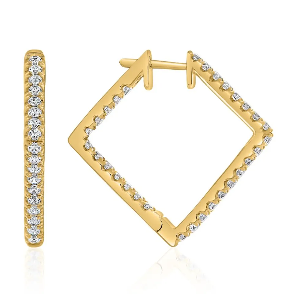 Diese Creolen begeistern mit ihrer besonderen Formgebung und den hochwertigen Materialien. Wahlweise können die Creolen in 585er und 750er Gelbgold bestellt werden. Dafür bitte die Wunsch-Legierung im Drop-down-Feld auswählen. Jede der eckigen Creolen ist auf der äußeren Vorderseite und der inneren Rückseite mit laborgezüchteten Diamanten (zusammen: 60; ca. 1,36 ct.; DEF/VVS-VS) besetzt. Lab Grown Diamanten besitzen die gleiche Härte und das gleiche Feuer wie natürliche Diamanten und zeichnen sich außerdem durch ihre Umweltfreundlichkeit aus. Da durch den Herstellungsprozess im Labor der Diamantabbau entfällt, sind sie eine nachhaltige Alternative zu natürlichen Diamanten. Der Ohrschmuck verfügt über ein Brilladia-Zertifikat.